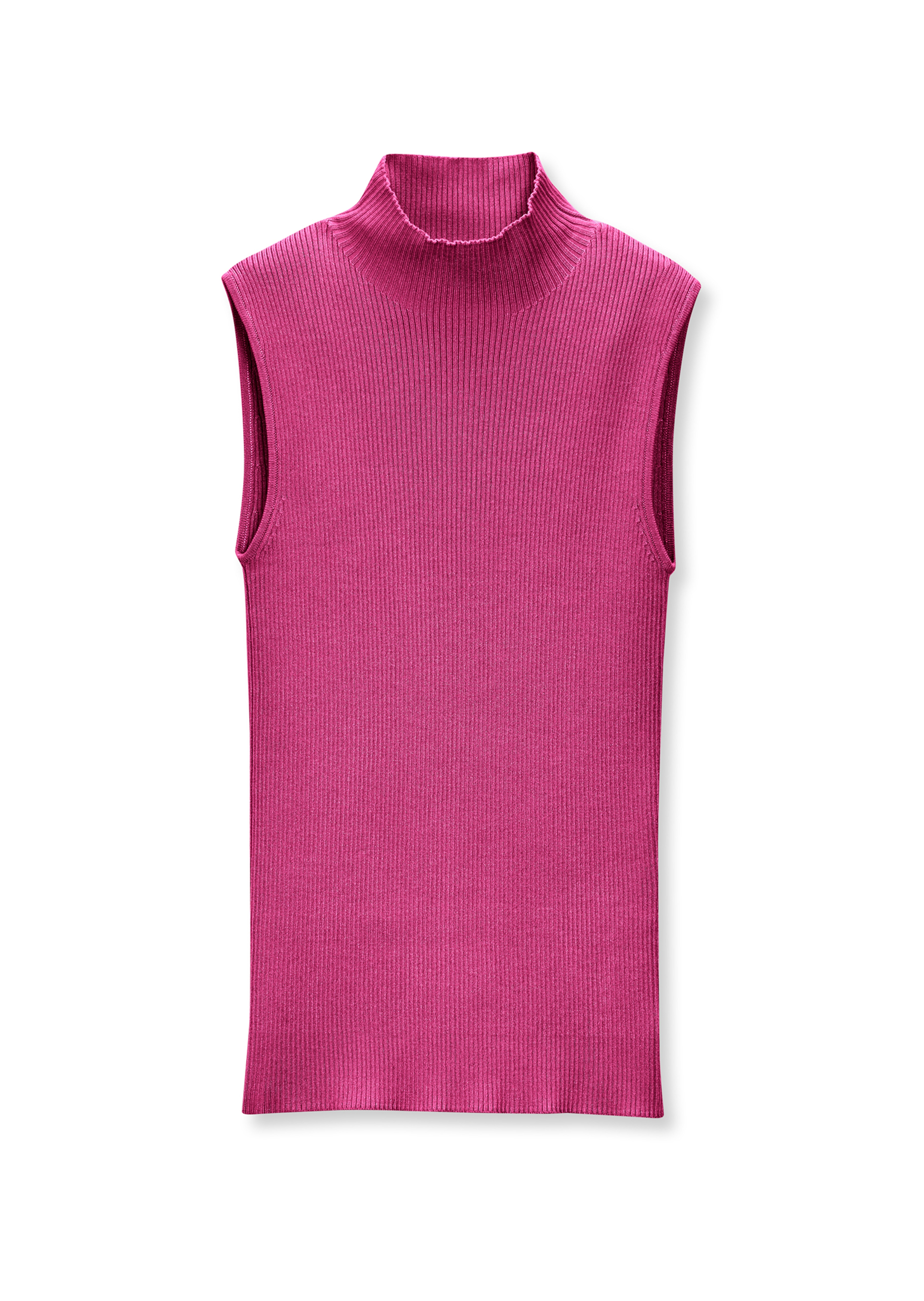 Als Solist oder unter Blazer & Co: Dieser ärmellose Pullover aus feinem Rippstrick ist für jeden Look ein perfektes Basic. Die figurnahe Form in aufwendiger Fully-fashion-Verarbeitung schmiegt sich durch den hohen Elasthan-Anteil wunderbar an und ist modisch mit Stehkragen gestaltet.