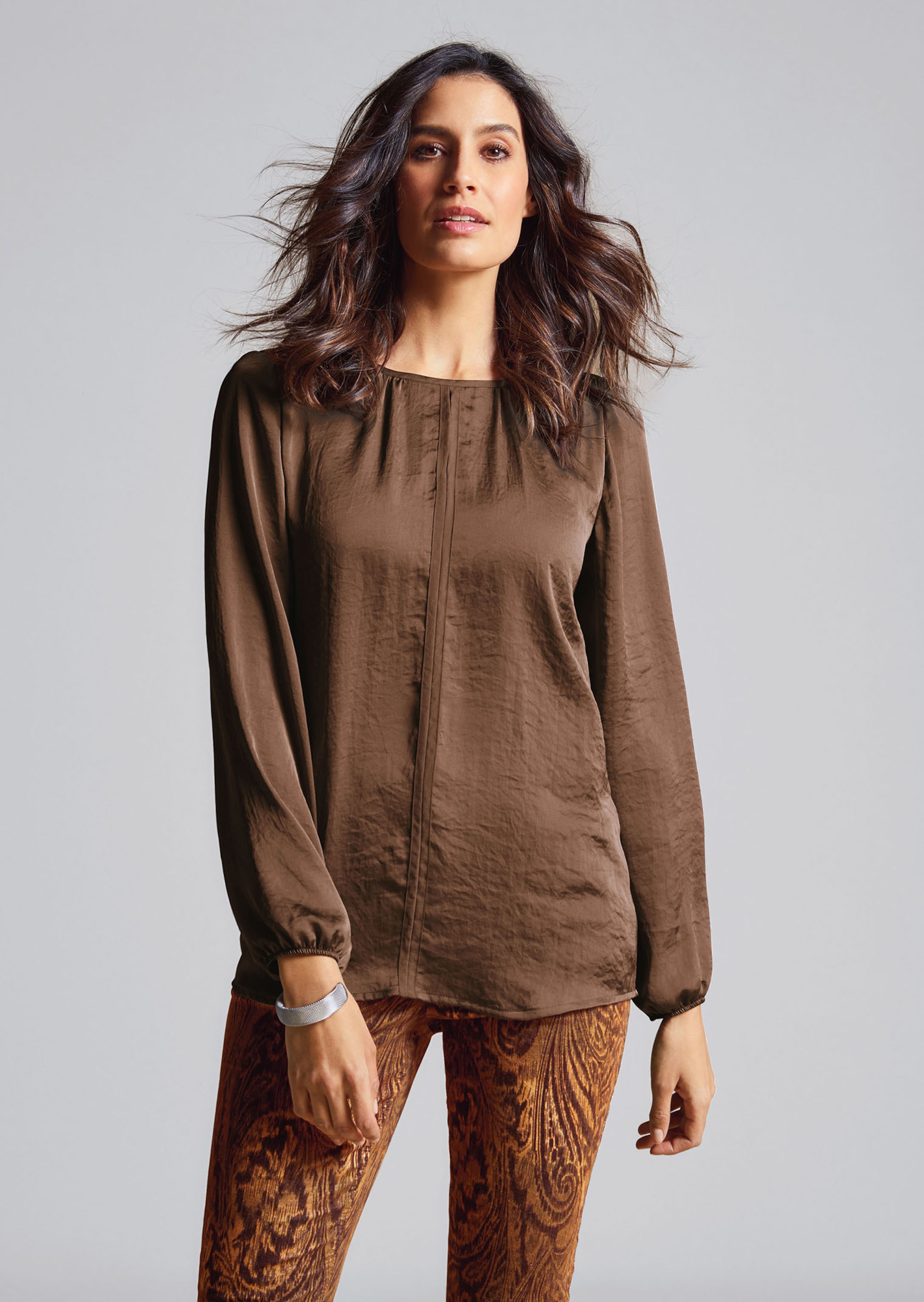 Chic glimmende kwaliteit in casual lijn met middenvoor gepositioneerde siernaad, split in het decolleté, sluiting met lusje en knoopje aan de achterkant, lange mouwen en licht afgeronde, elastische zoom. Ronde halslijn met vrouwelijke plooiing. Met figuurnaden op de borst vanaf Mt. 40.