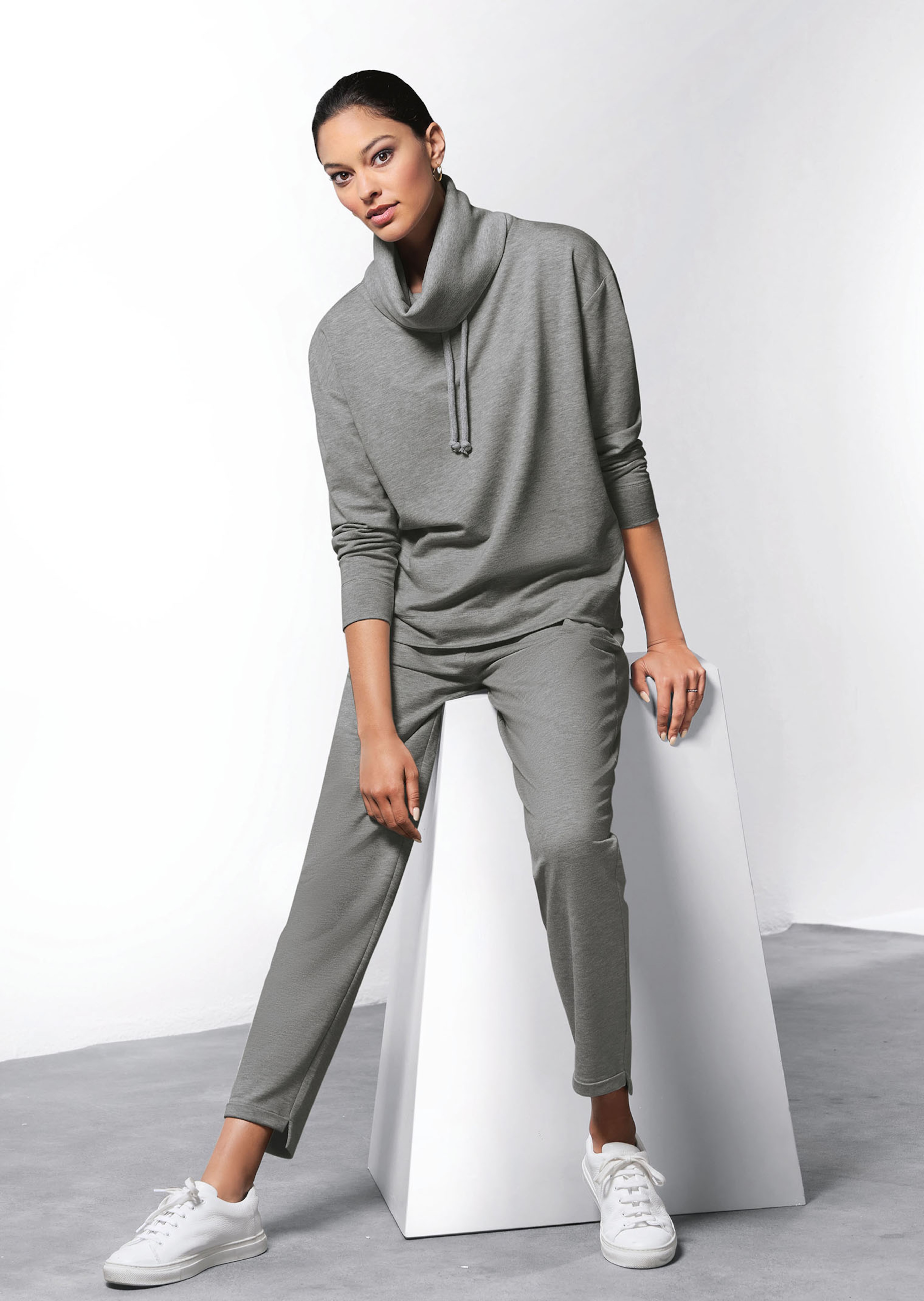 In modieuze jogpants-style. Flatteus op de huid vallende sweatstofkwaliteit met schuin afgewerkte steekzakken, zoomsplitjes opzij en aan de voorkant omhoog omgeslagen zoom van de pijpen. Comfortabele, elastische tailleband van geribde jersey met geraffineerd tunnelkoordje.