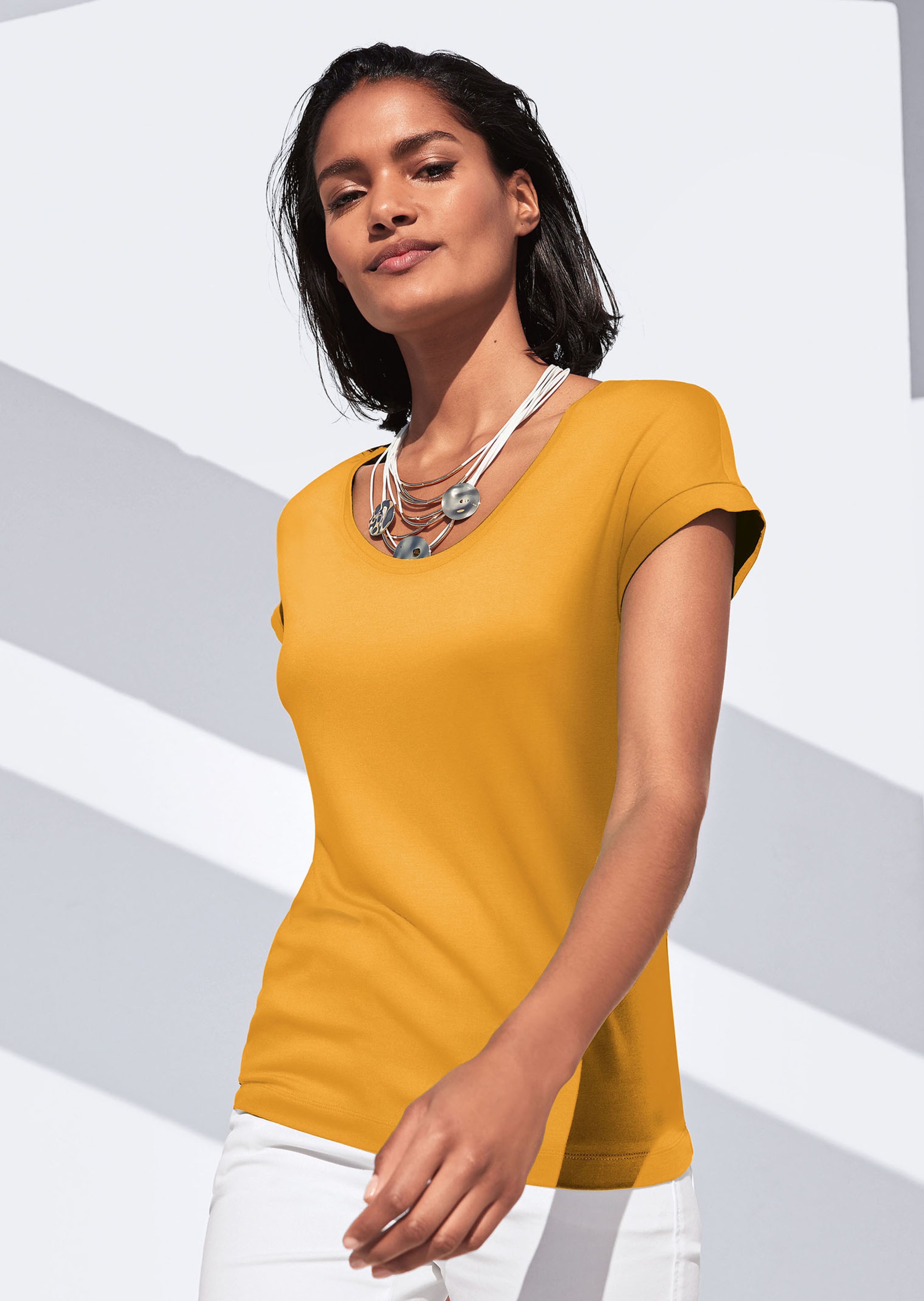 Hoogwaardige allrounder van stretchjersey. Met aangeknipte schouders en een gepaspeleerde, ronde hals.