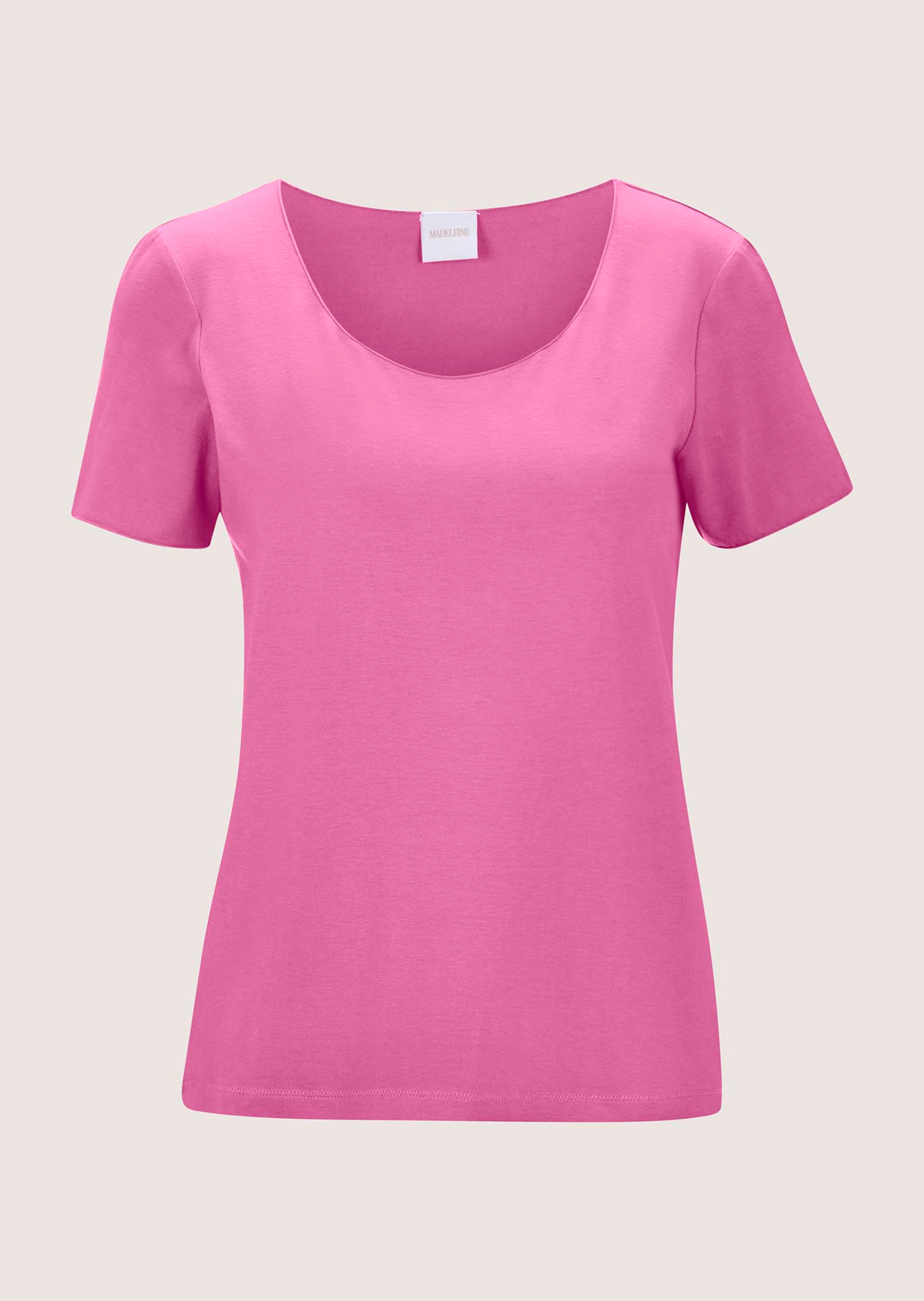 Van huidvriendelijke stretchviscose in een vrouwelijk getailleerd, kort model met overlock-randen langs de ronde hals en halflange mouwen.