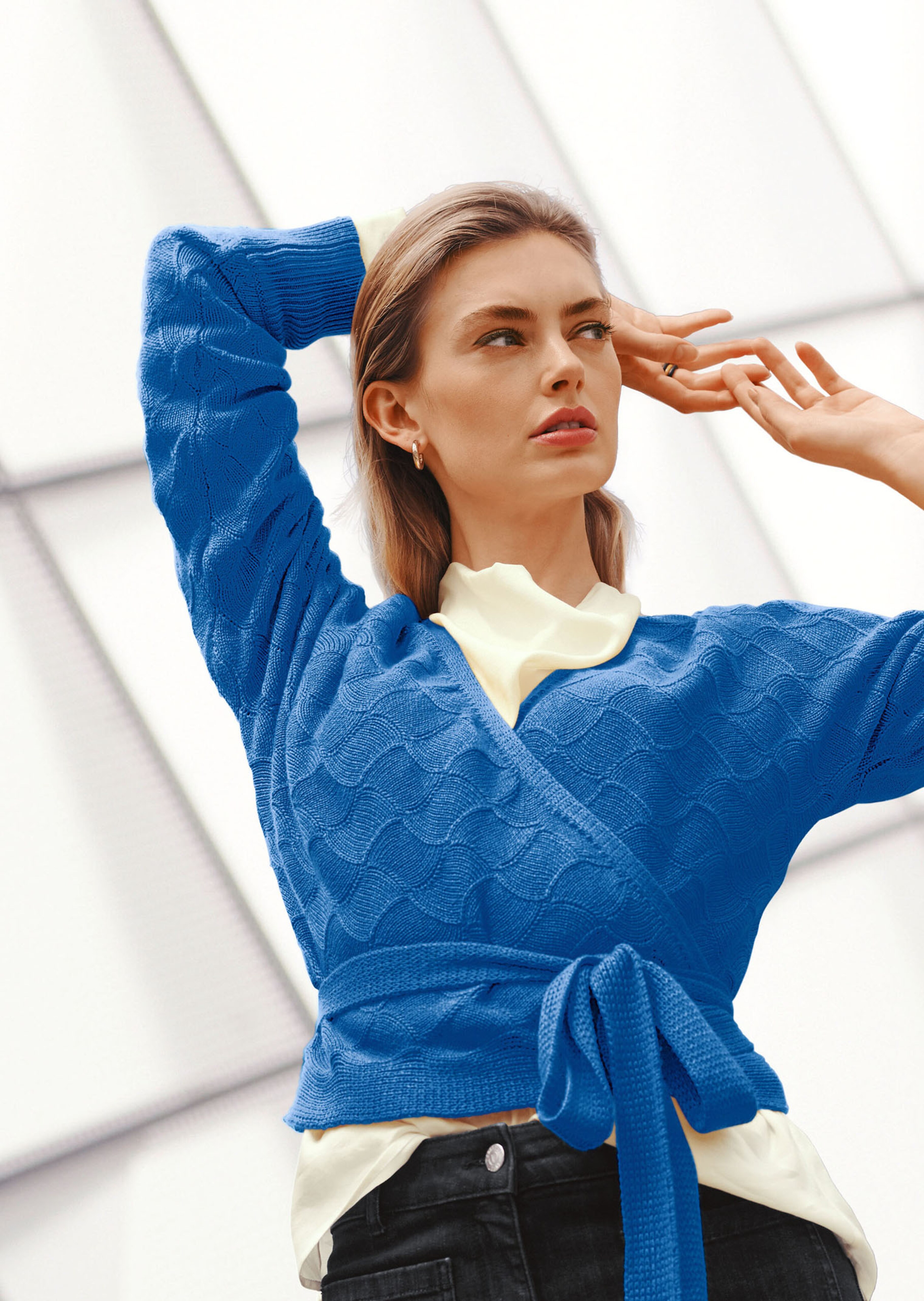 Een chic vestje van fijne tricot in vrouwelijk wikkelmodel. Het vestje is hoogwaardig in model gebreid, heeft een stijlvol golvend patroon en een diepe V-hals en wordt met lange striklinten gewikkeld, die door een kleine uitsparing in de naad opzij zijn geleid.