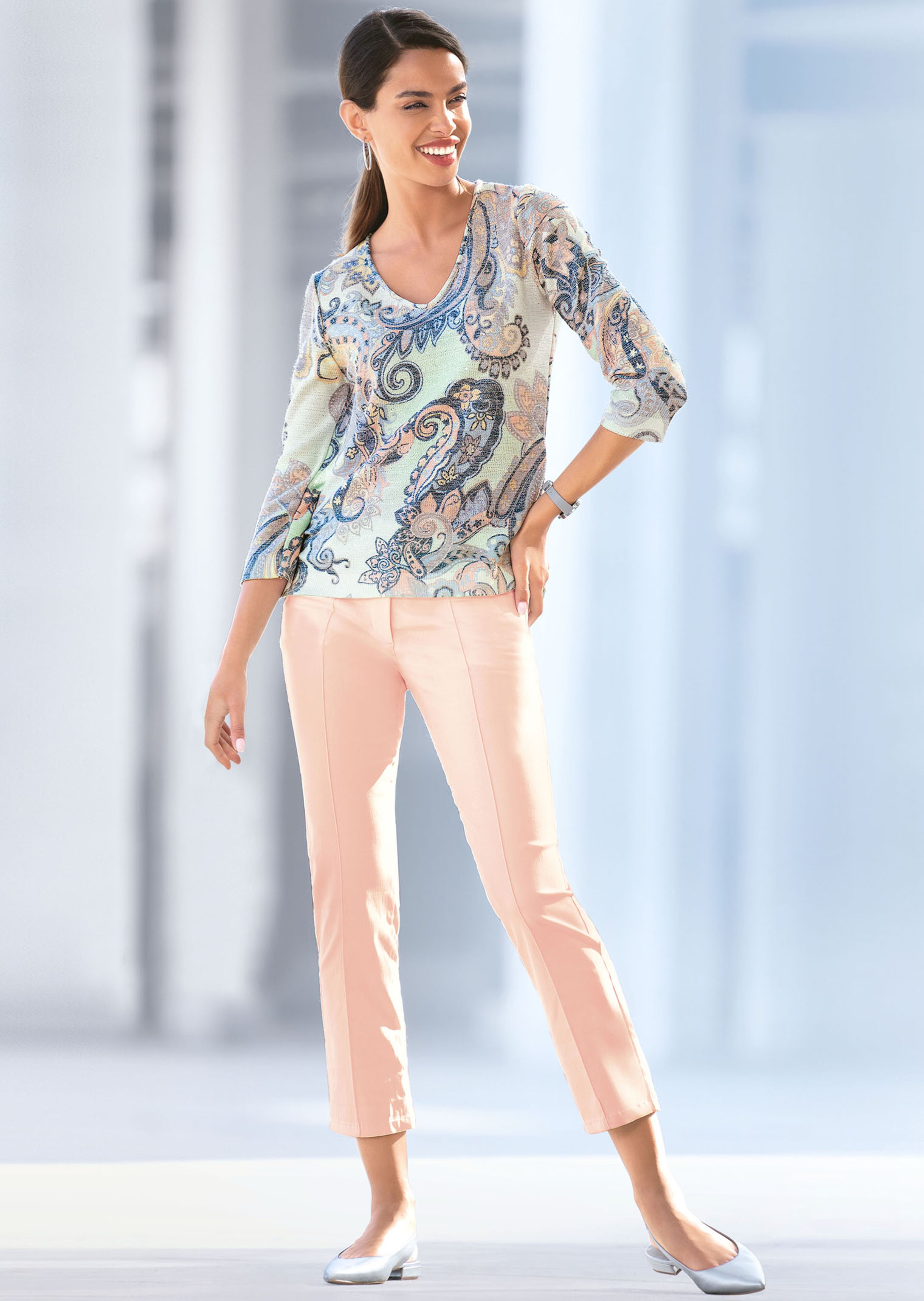 Superstretch begeistert mit seinen fantastischen Eigenschaften! Die Sommer Stretchhose zeichnet eine schöne, schlanke Linie und trägt sich durch den Viskose-Mix herrlich angenehm. Der schlanke 7/8-Style ist mit Formbund, Gürtelschlaufen, vorderseitigen Biesen und Stecktaschen gestaltet. Ein MADELEINE Logoknopf und eine Logo-Plakette verraten auf dezente Weise die Herkunft der Sommerhose. Durch zwei Grössenläufe mit N- und Kurzgrössen können sie auch kleinere Frauen prima tragen. Aktuelle Farben bieten sich für sommerliche Stylings an.