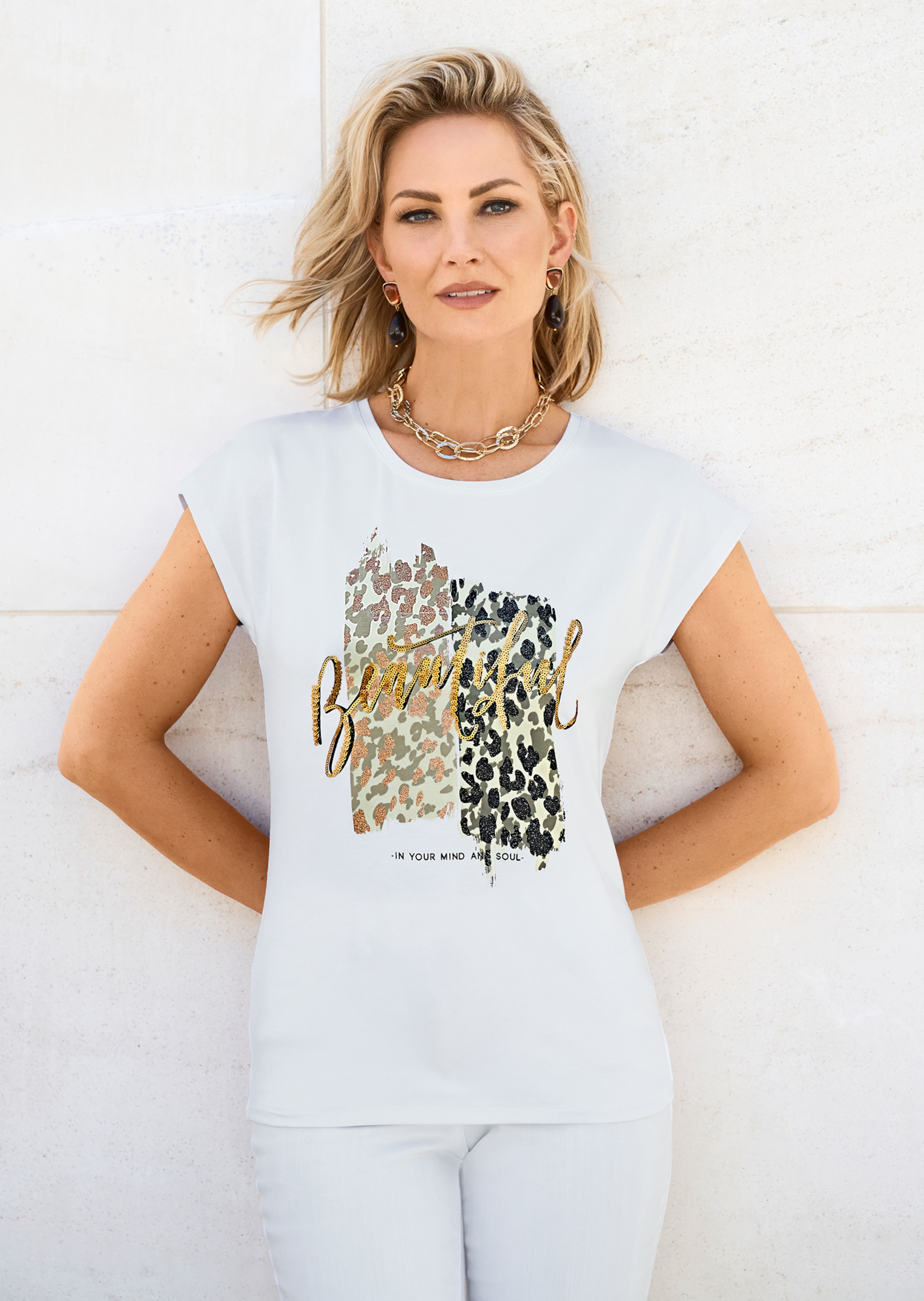 Ein Basic für unbeschwerte Sommer-Looks, angenehm auf der Haut und mit trendstarkem Akzent. Der glanzvolle, vorderseitige Druck des Shirts ist wertvoll platziert und wird zusätzlich von glitzernden Pailletten akzentuiert. Ein Style, der Schwung in den Look bringt und mit fein paspeliertem Rundhals-Ausschnitt und überschnittener Schulterpartie gearbeitet ist.
