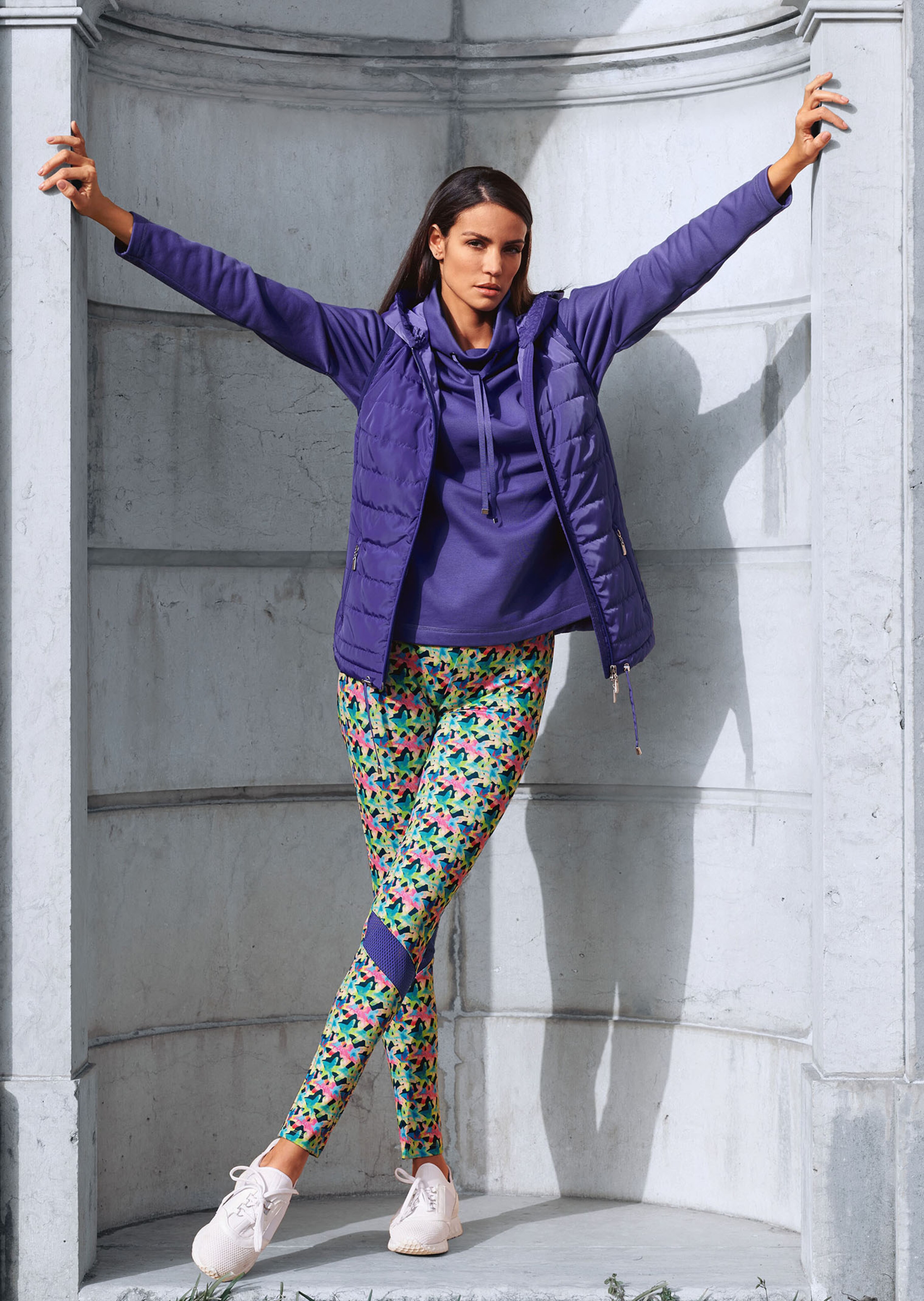 En version unie ou avec imprimé unique. Taille large, petite poche zippée au dos et empiècements fantaisie en filet en biais devant.