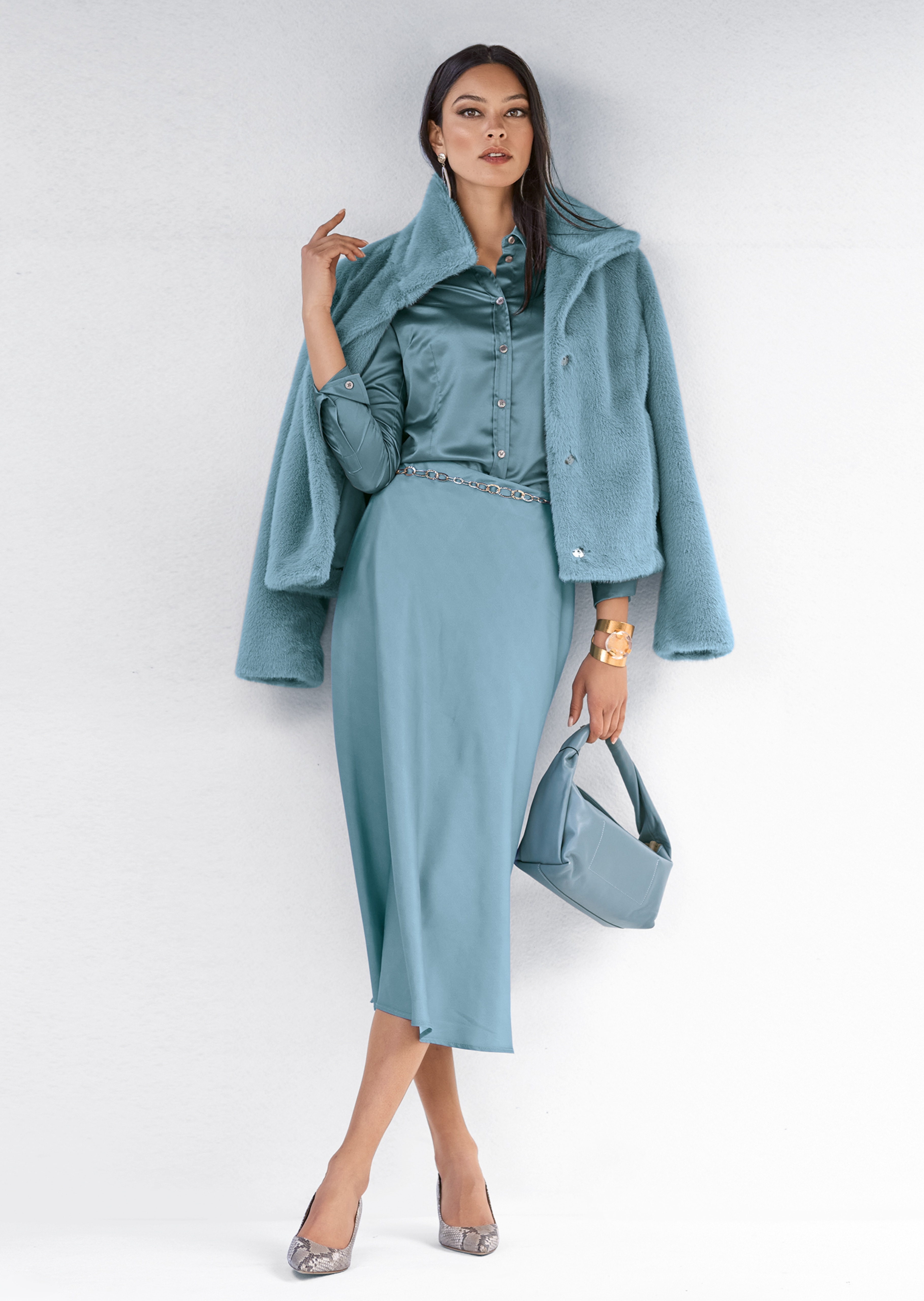 Satin fluide et légèrement brillant. Coupe légèrement évasée vers le bas. Longueur seyante. Zip sur le côté.