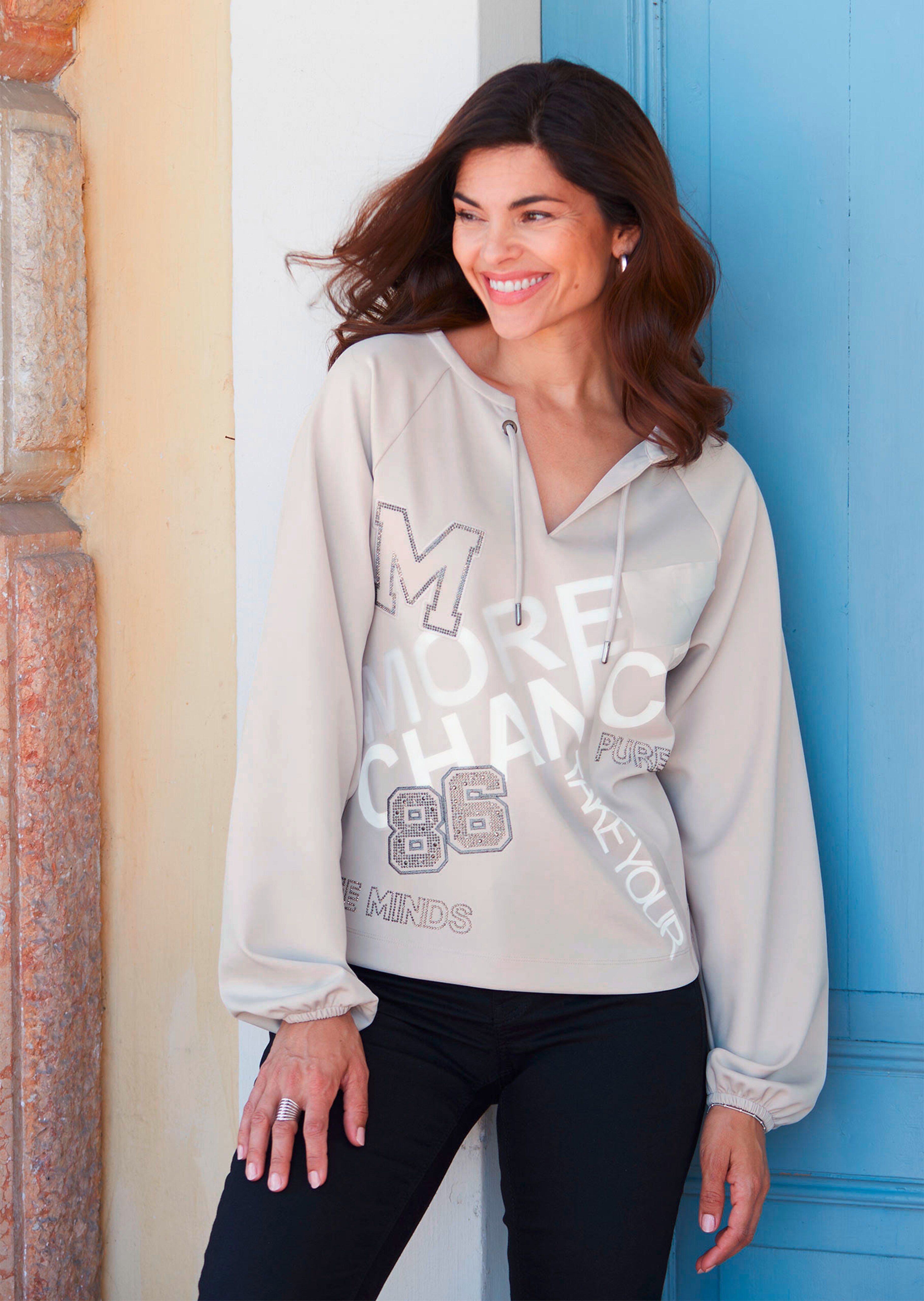 Das lässige Sweatshirt von MONARI ist großzügig geschnitten und sitzt angenehm leger. Den femininen V-Ausschnitt schmückt eine Deko-Kordel, die Raglanärmel schließen mit Gummibündchen ab – perfekt, um sie nach Lust und Laune hochzuschoppen. Blickfang ist der dekorative Frontdruck, der mit schönen Schmucksteinen verziert ist. Länge in Gr. 38 ca. 60 cm. Styling-Tipp: Sportlich unterwegs oder gemütlich auf der Couch – das Sweatshirt ist für beides zu haben. Mit legerer Joggpants und Sneakern vervollständigen Sie den sportiven Look!