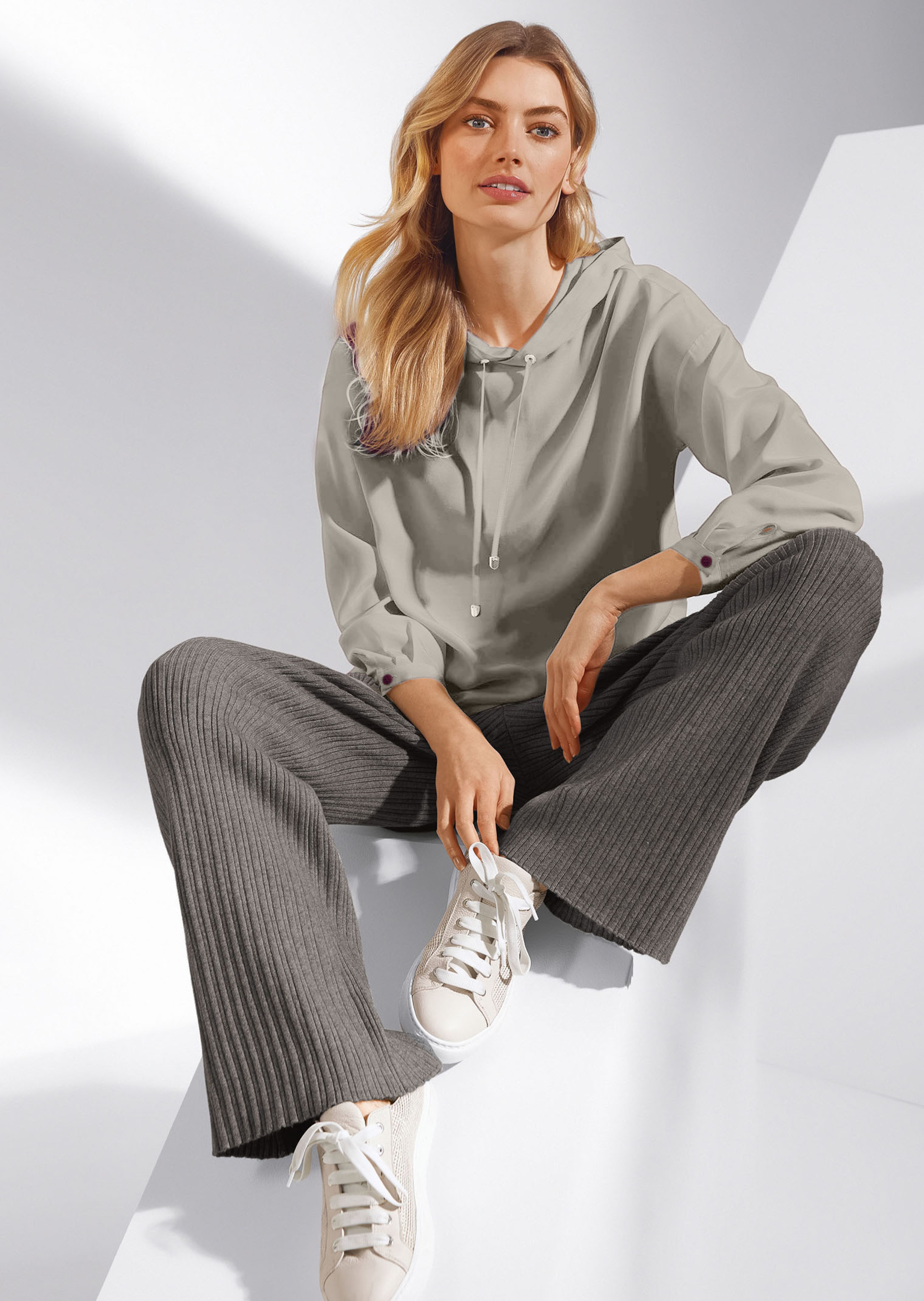 Viscose fluide. Coupe décontractée. Épaules descendues et manches longues avec fins poignets boutonnés. Base droite avec fentes sur les côtés. Capuche avec passant tunnel et long ruban en textile avec extrémités en métal.
