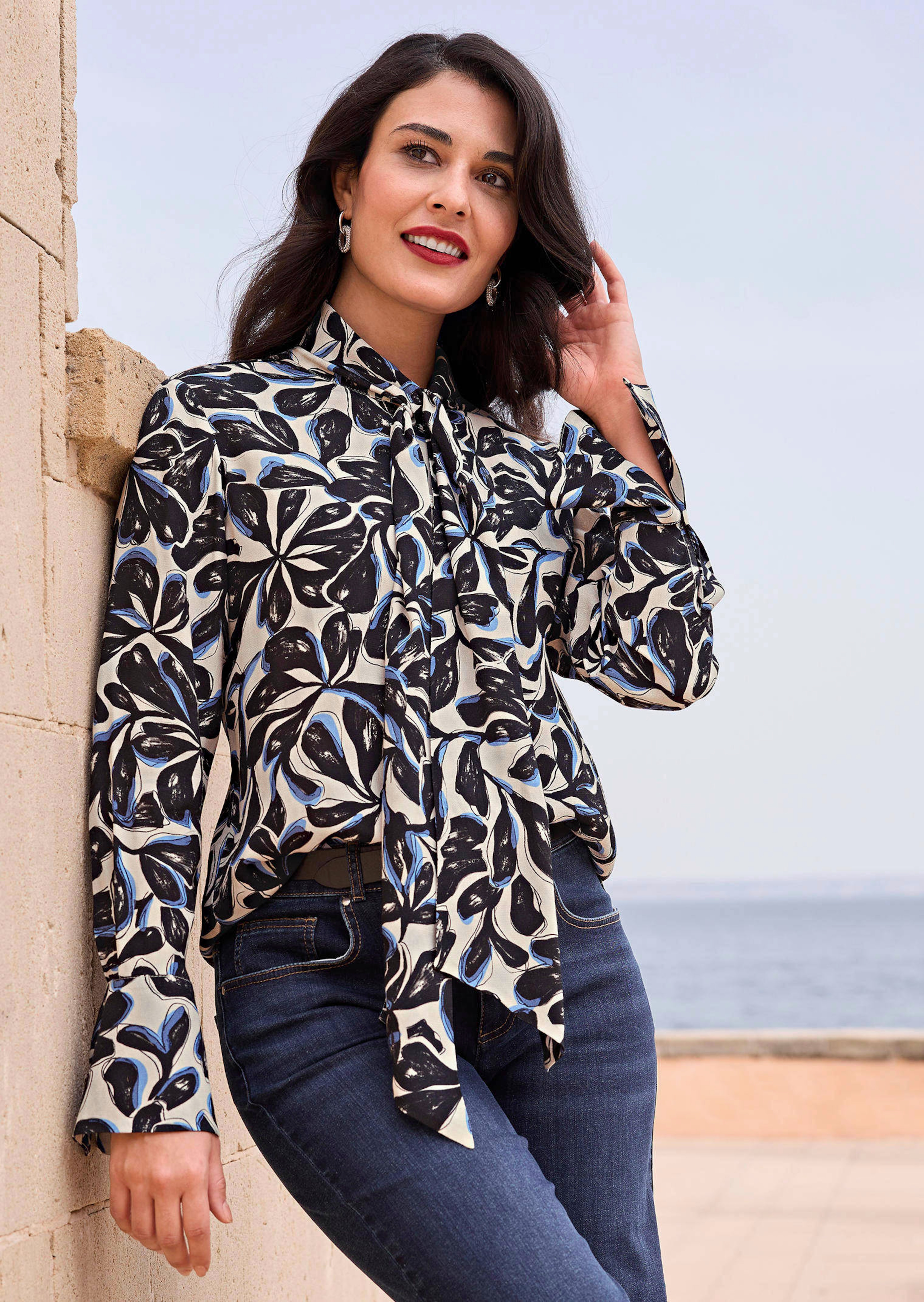 Rubans à nouer sur l'encolure et poignets volantés. Matière structurée aspect crêpé. Imprimé raffiné.