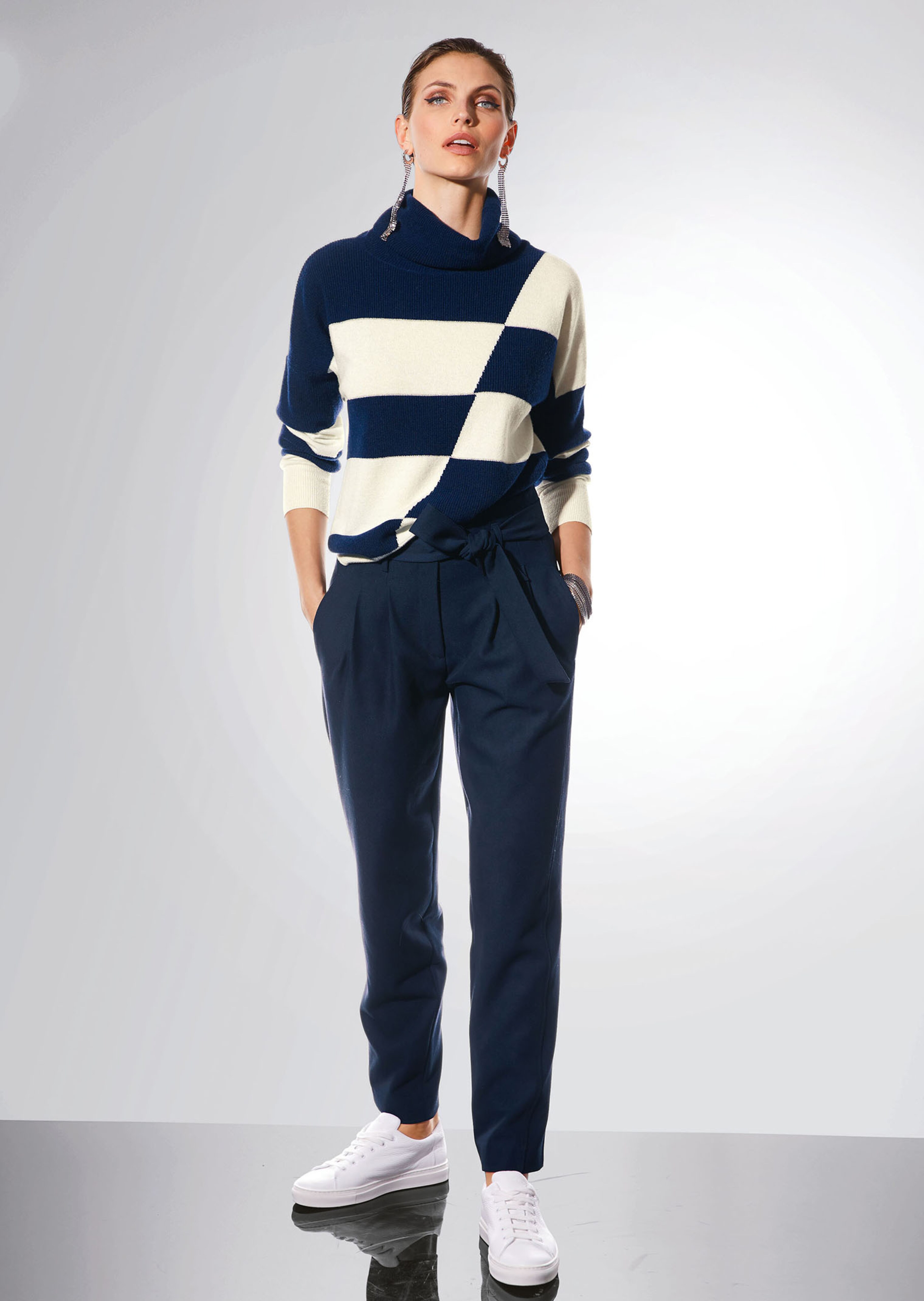 Larges rayures contrastantes. Ligne maxi décontractée. Col roulé dégagé, épaules descendues et manches longues. Bords-côtes d'une tenue irréprochable.