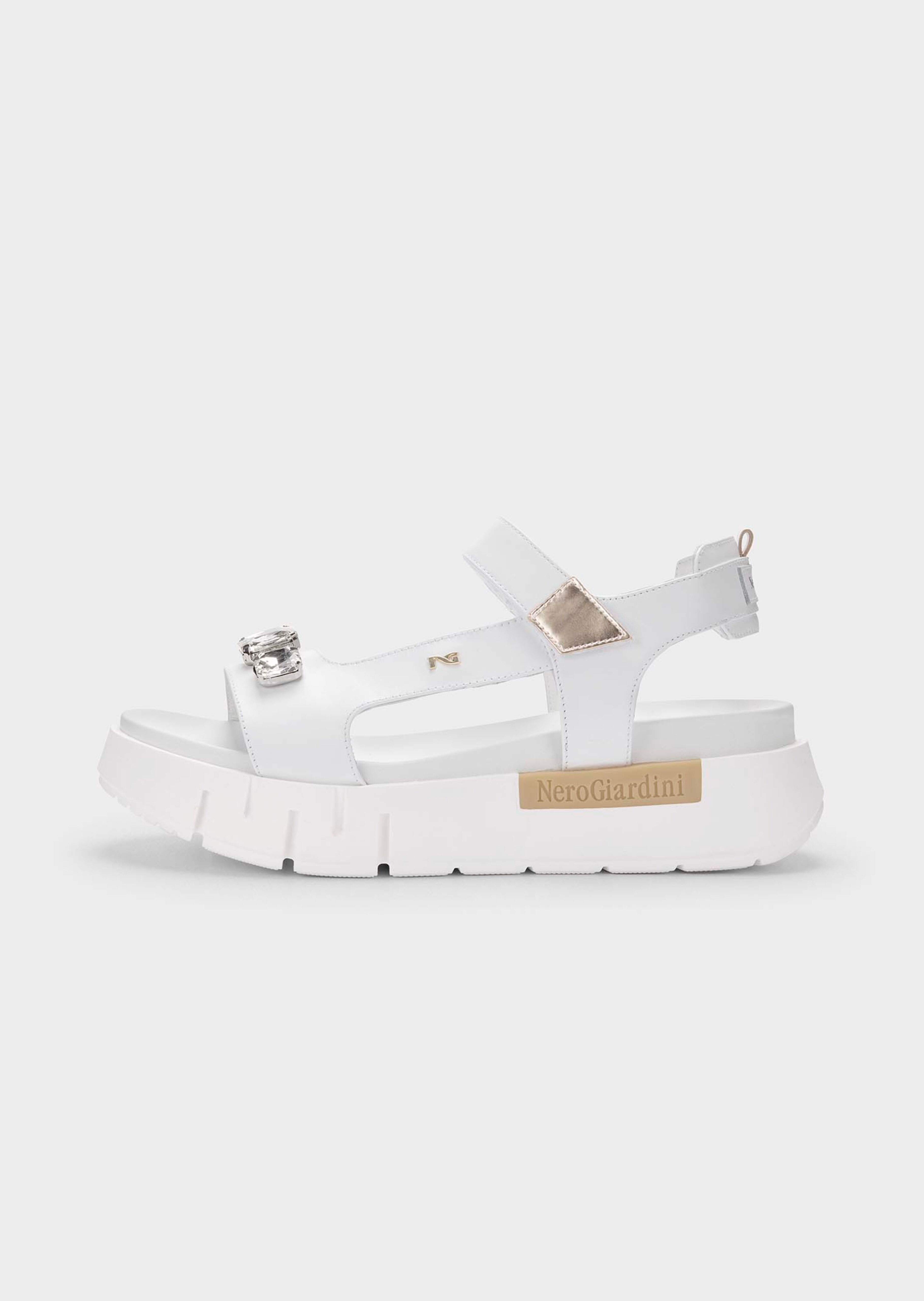 En cuir, avec semelle à plateau, fermeture scratchée et pierres brillantes.