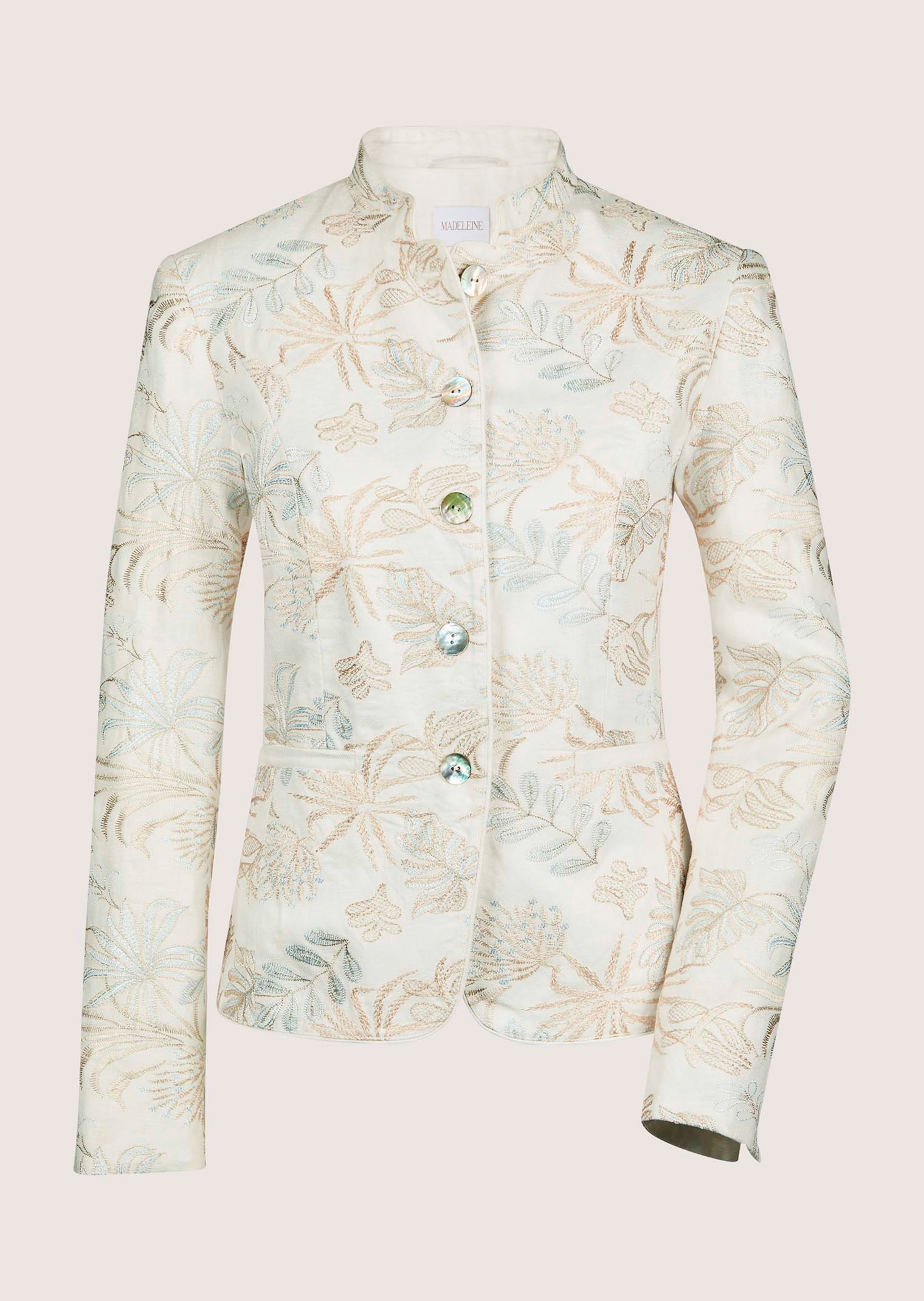 Kort model met kunstzinnig borduursel rondom. Met een extravagante, opstaande kraag, sierzakken, knopenlijst en lange mouwen met een splitje. Het getailleerde model creëert een flatteus silhouet.