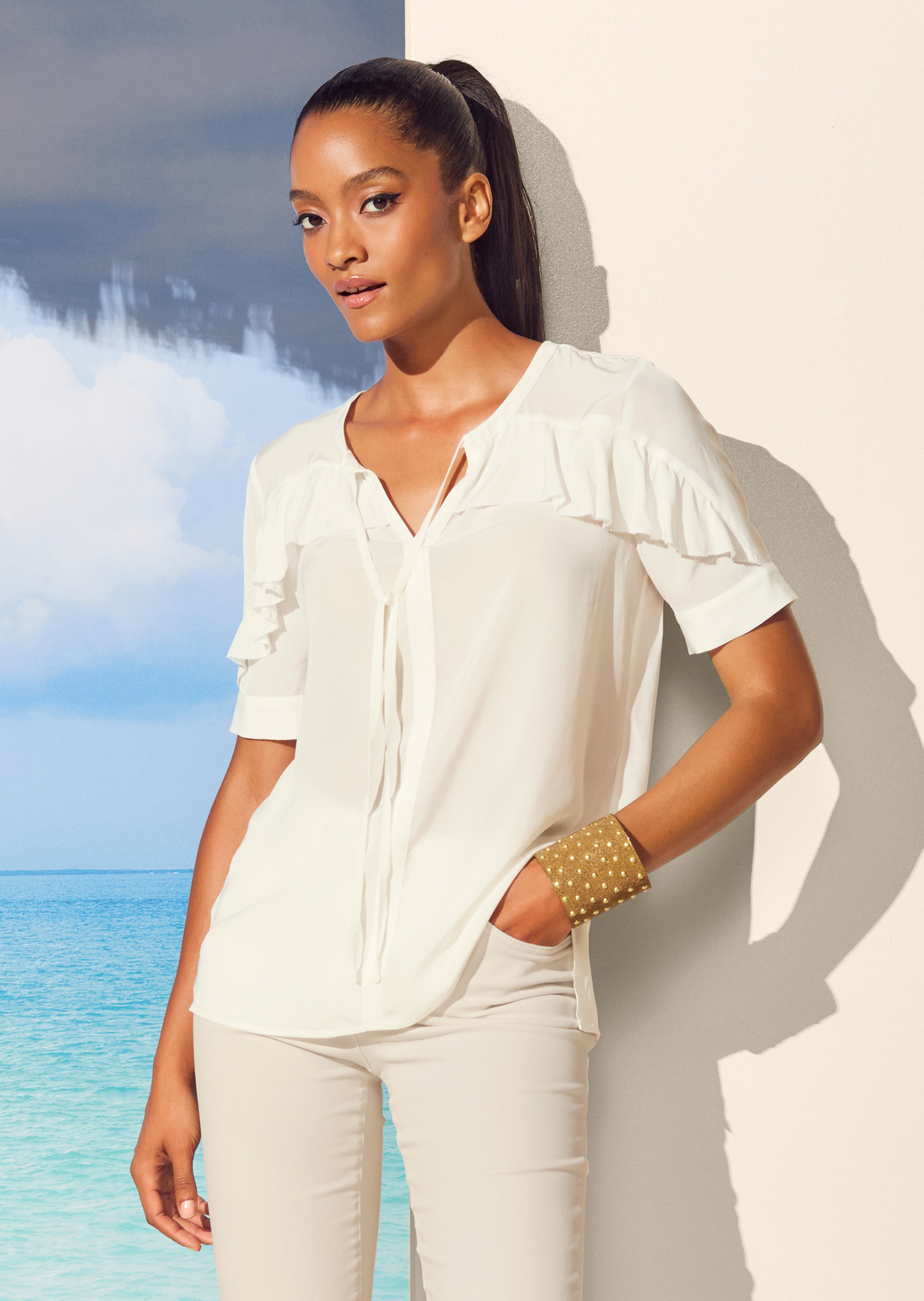 Softly flowing viscose in an elegant shape, comfortable to slip on with ruffles at the front. Half-length sleeves with slender button cuffs. Hemline with small side vents and fine drawstrings. Small pleats on the back yoke.