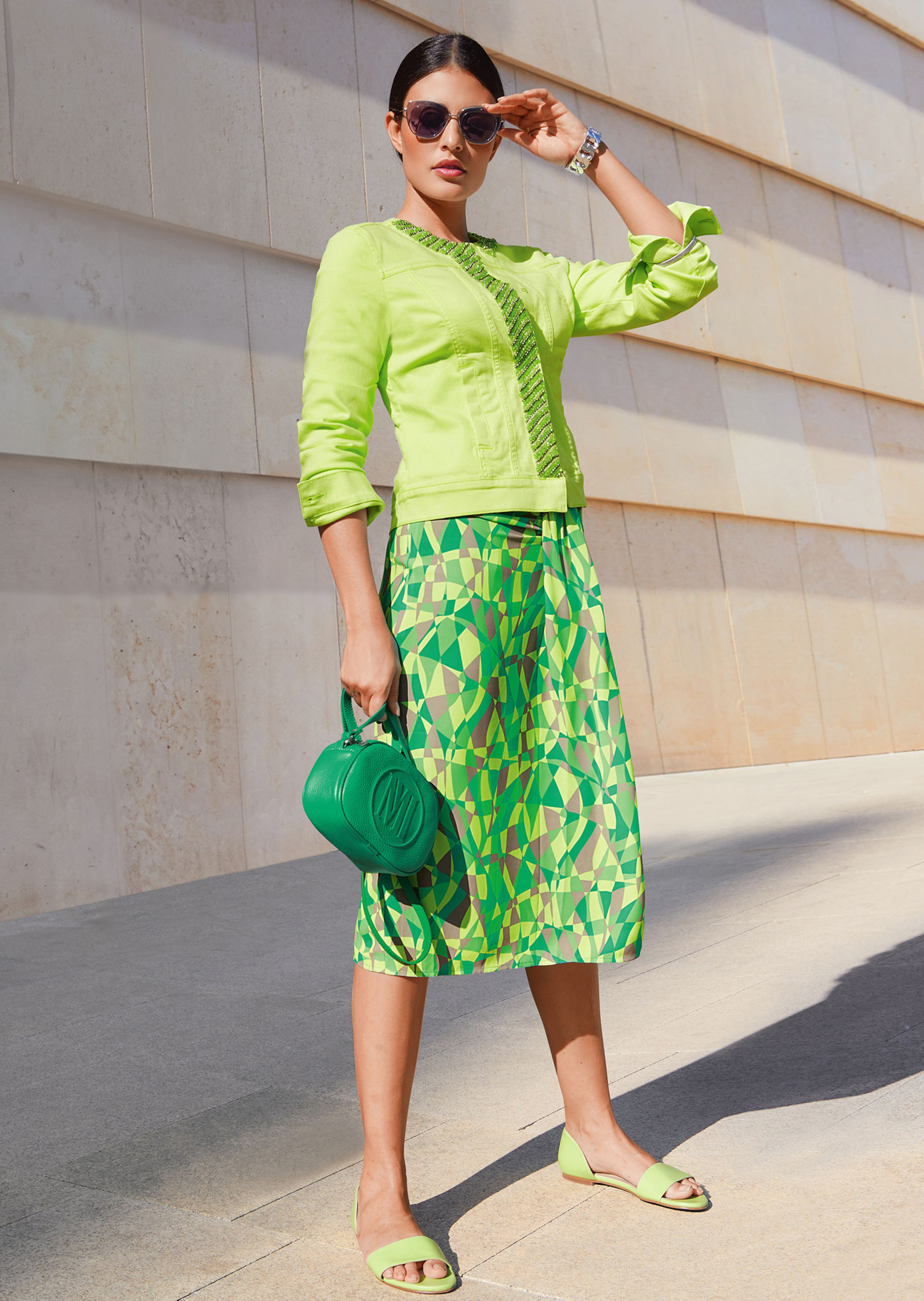 Short, moderately tailored, collarless shape with hook and eye fastener, welt pockets and ornamental stones.
