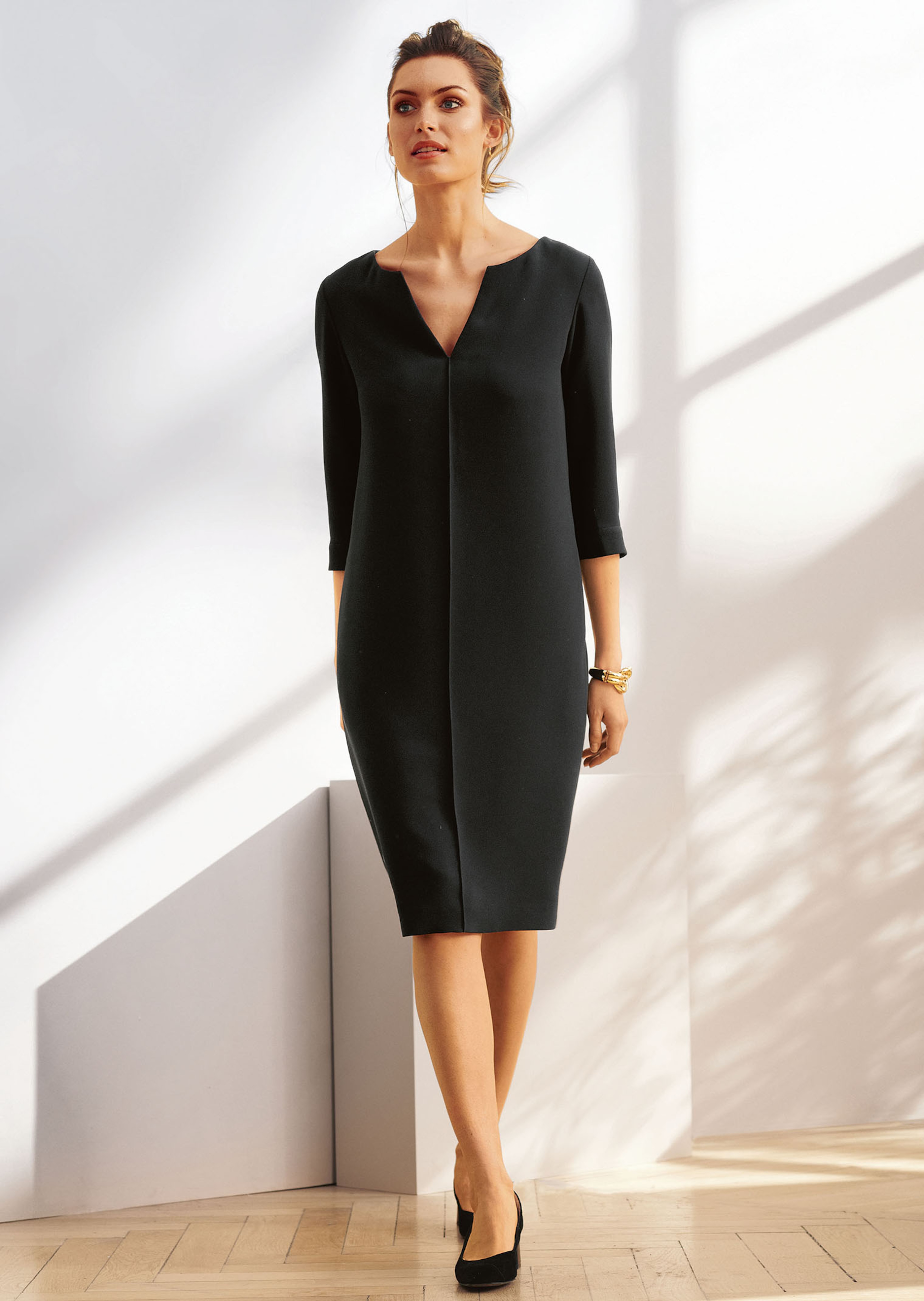 In casual and elegant H-shape with decorative zip along the front centre. Contemporary small V-slit at boat neckline, wide 3/4-length sleeves and seam pockets.
