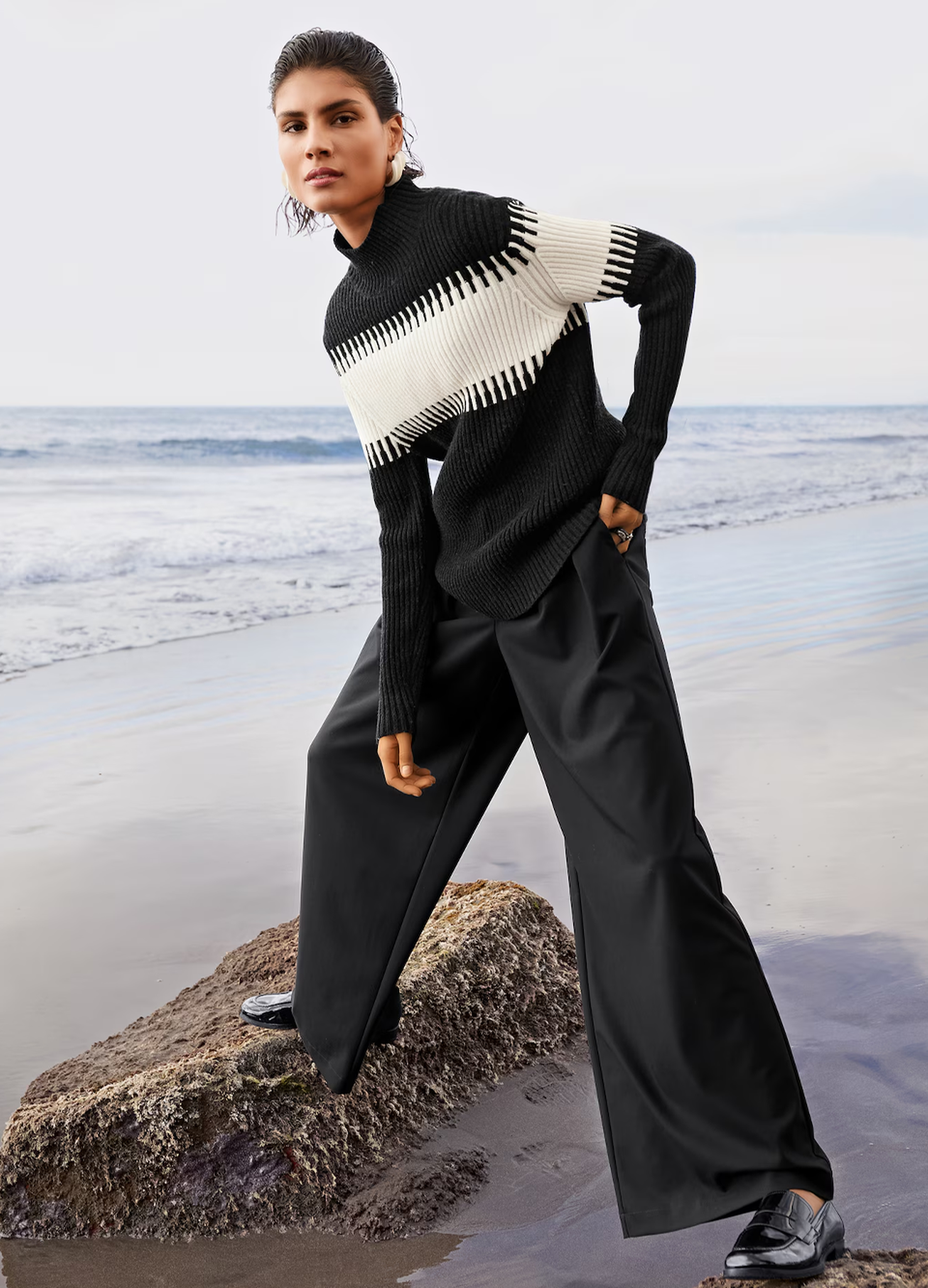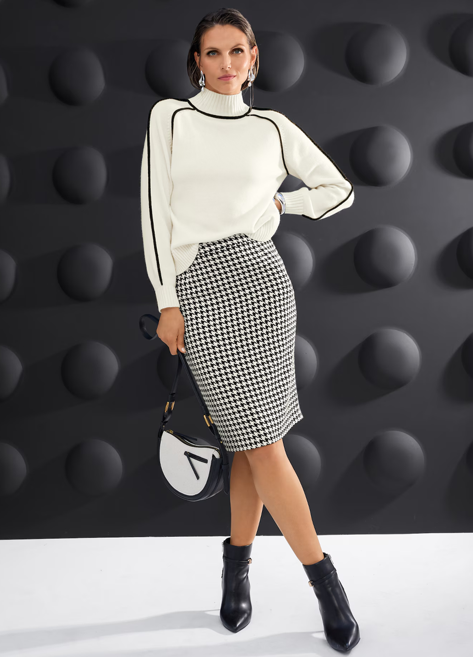 Styling-Tipp: Eine leicht schimmernde weiße Bluse mit Schleife zur matt-schwarzen Anzughose, ein schwarz-weißer Karomantel oder ein schlichtes Kleid mit kontrastierenden Nähten – so bleibt das Duo spannend und nie langweilig.