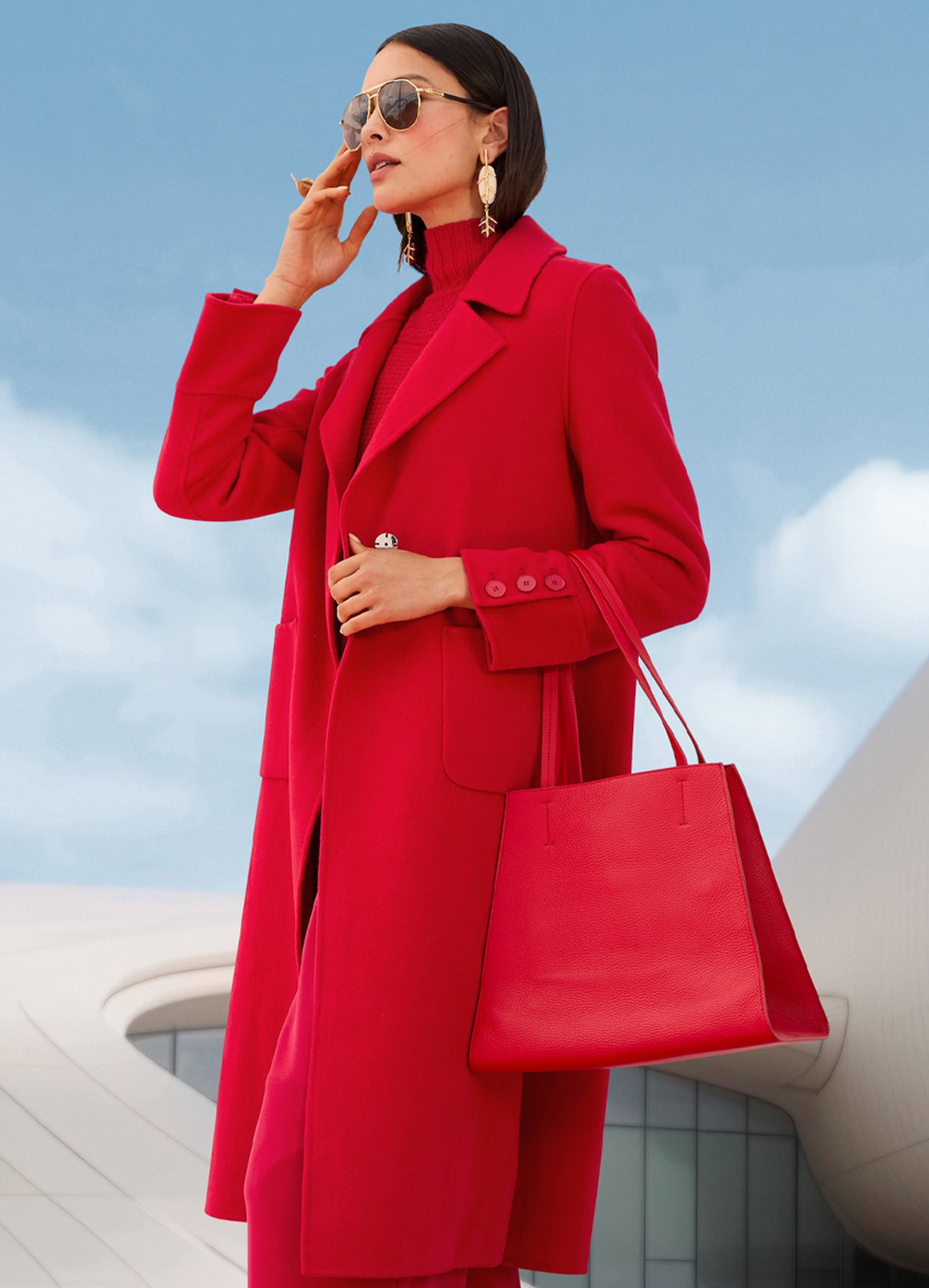 Knallrot und Bordeaux – das ist der Inbegriff von Eleganz mit Tiefe. In dieser Saison feiern die beiden Rottöne ein großes Comeback, besonders in monochromen Layer-Looks. Das kräftige Signalrot bringt Energie, während Bordeaux für Ruhe und Reife steht. Zusammen ergeben sie ein luxuriöses, fast königliches Duo.