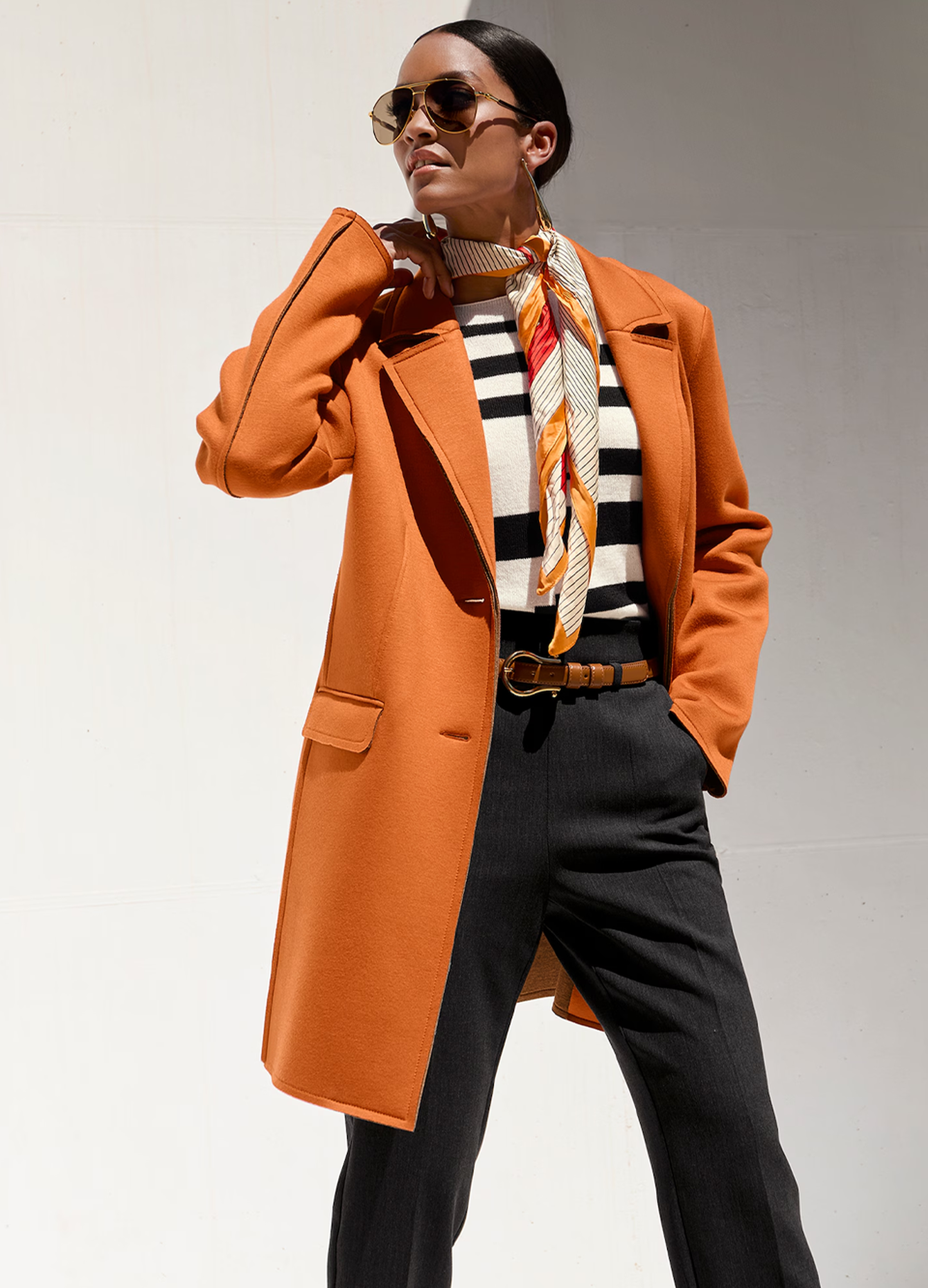 Styling-Tipp: Eine orangefarbene Bluse unter einem schwarzen Blazer oder ein schwarzer Midirock mit einem Strickpullover in Burnt Orange – das wirkt gleichzeitig edel und energiegeladen.