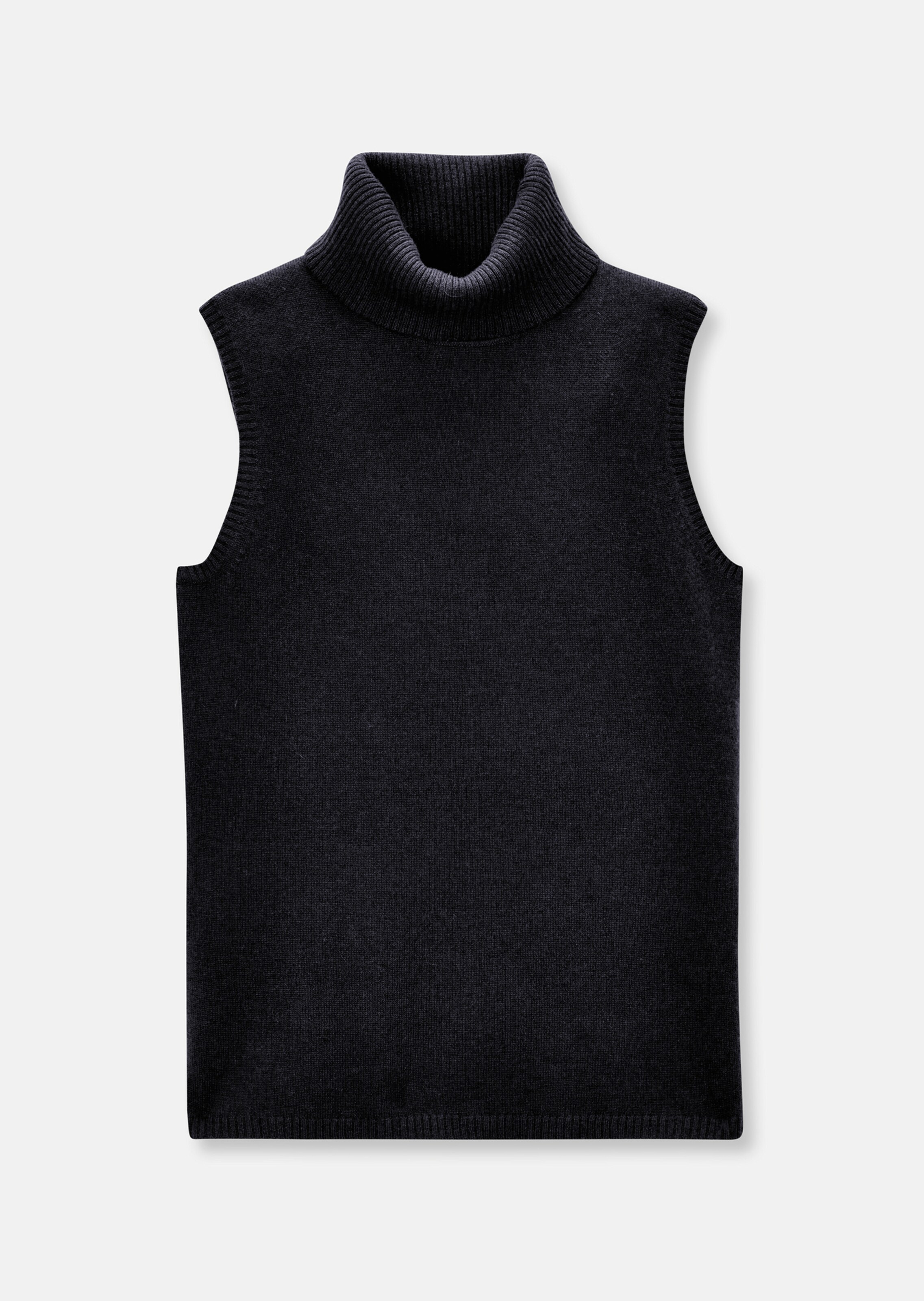 Ein Strickpartner von klassisch eleganter Ausstrahlung, der vielseitig kombiniert werden kann! Flauschig weiches, glatt gestricktes Kaschmirgarn zeigt sich ärmellos und in leicht taillierter Linie. Im Kontrast dazu ein fein gerippter Rollkragen sowie Rippenblenden am Armloch und Saumkante. Eine hochwertige, französische Schulterverarbeitung machen den Luxus-Look perfekt.