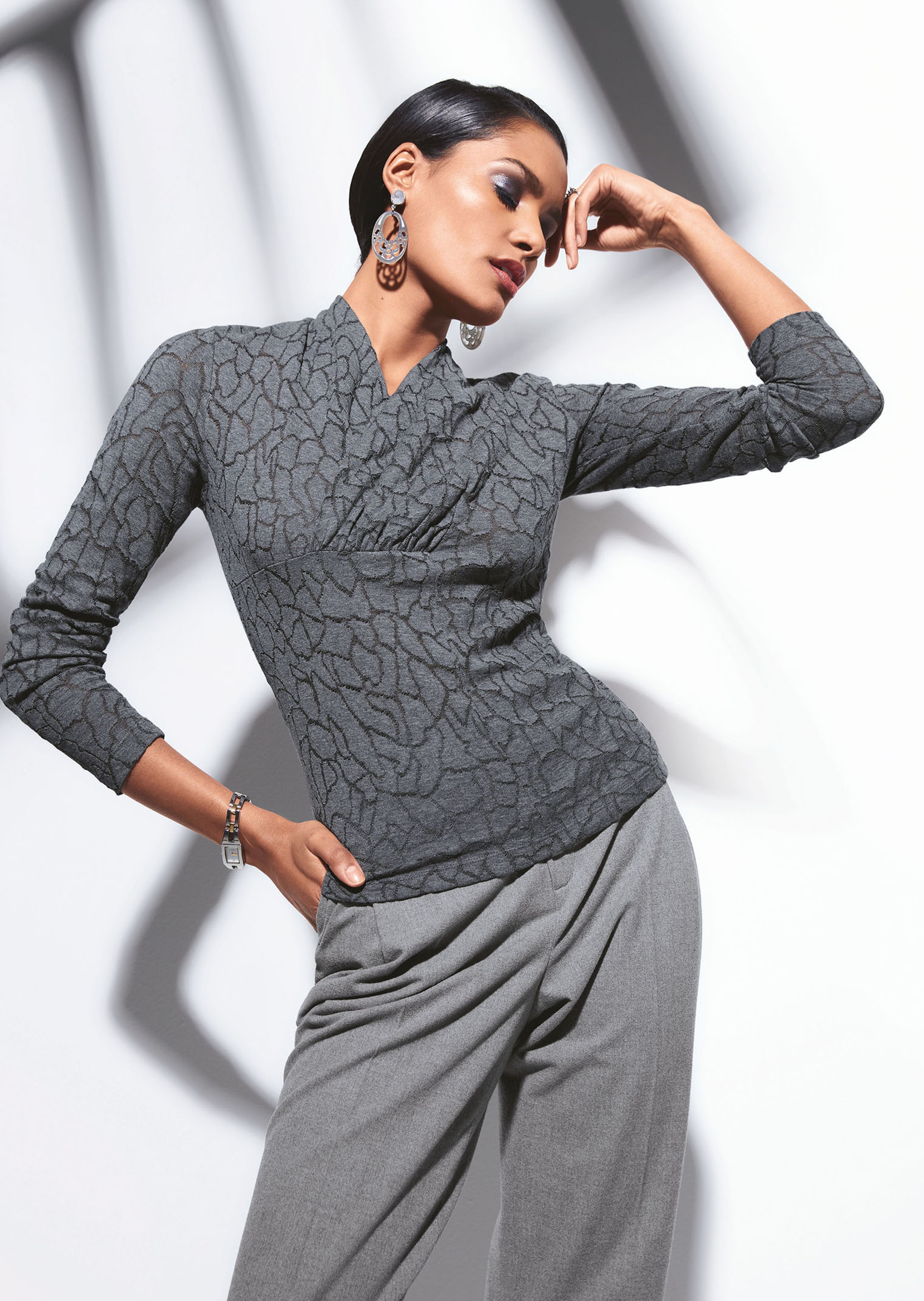 Das Shirt im Wickel-Look überzeugt mit einem Plus an Modernität und macht zahlreiche Kombinationen zu einem echten Hingucker. Das Ausbrenner-Muster verleiht dem Oberteil seine top-aktuelle Optik und lässt dezent Haut durchschimmern. Leicht tailliert betont es die feminine Silhouette und setzt das Dekolleté raffiniert in Szene. Lange, schlanke Ärmel und ein kleiner Stehkragen runden den Style gekonnt ab und verleihen Stil und Eleganz. Die Garnmischung mit hohem Baumwoll-Anteil ist angenehm im Trage-Gefühl und leicht zu pflegen. Ein Trend-Begleiter, der den verschiedensten Outfits eine top-aktuelle Note verleiht und immer für einen perfekten Auftritt sorgt.