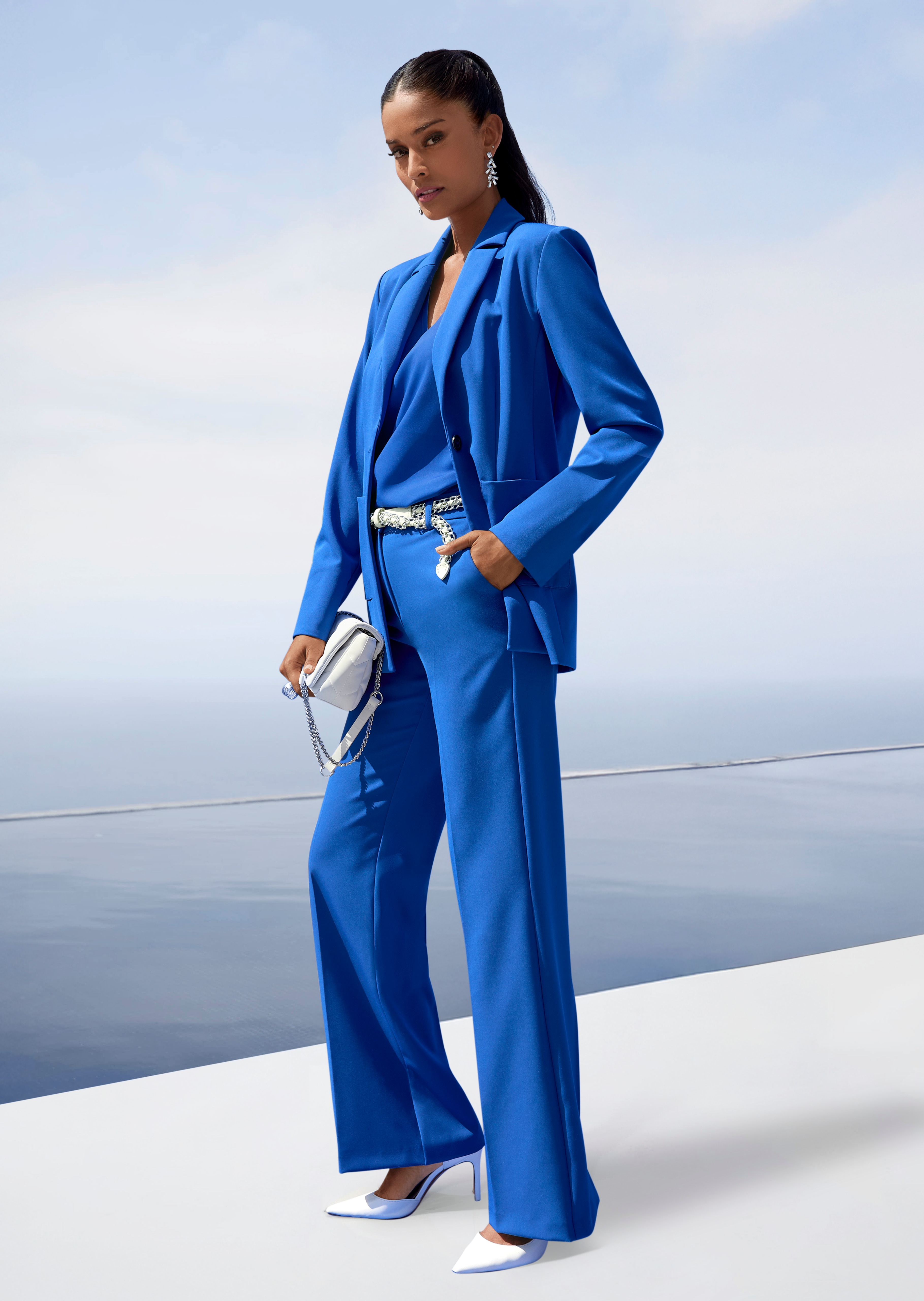 Ein modisch gepflegter Hosen-Look in trendstark ausgestellter Form. Er zaubert optisch lange, schlanke Beine und sorgt durch Bügelfalten an Vorder- und Rückseite für einen seriösen Auftritt. Der bequeme Stretch schenkt angenehme Bewegungsfreiheit und wird am Formbund per Knopf, Haken und Zipper fixiert. Seitliche Schubtaschen bieten praktischen Stauraum, während rückseitige Zierpaspeln Gesäßtaschen imitieren. Gürtelschlaufen machen den Style komplett.