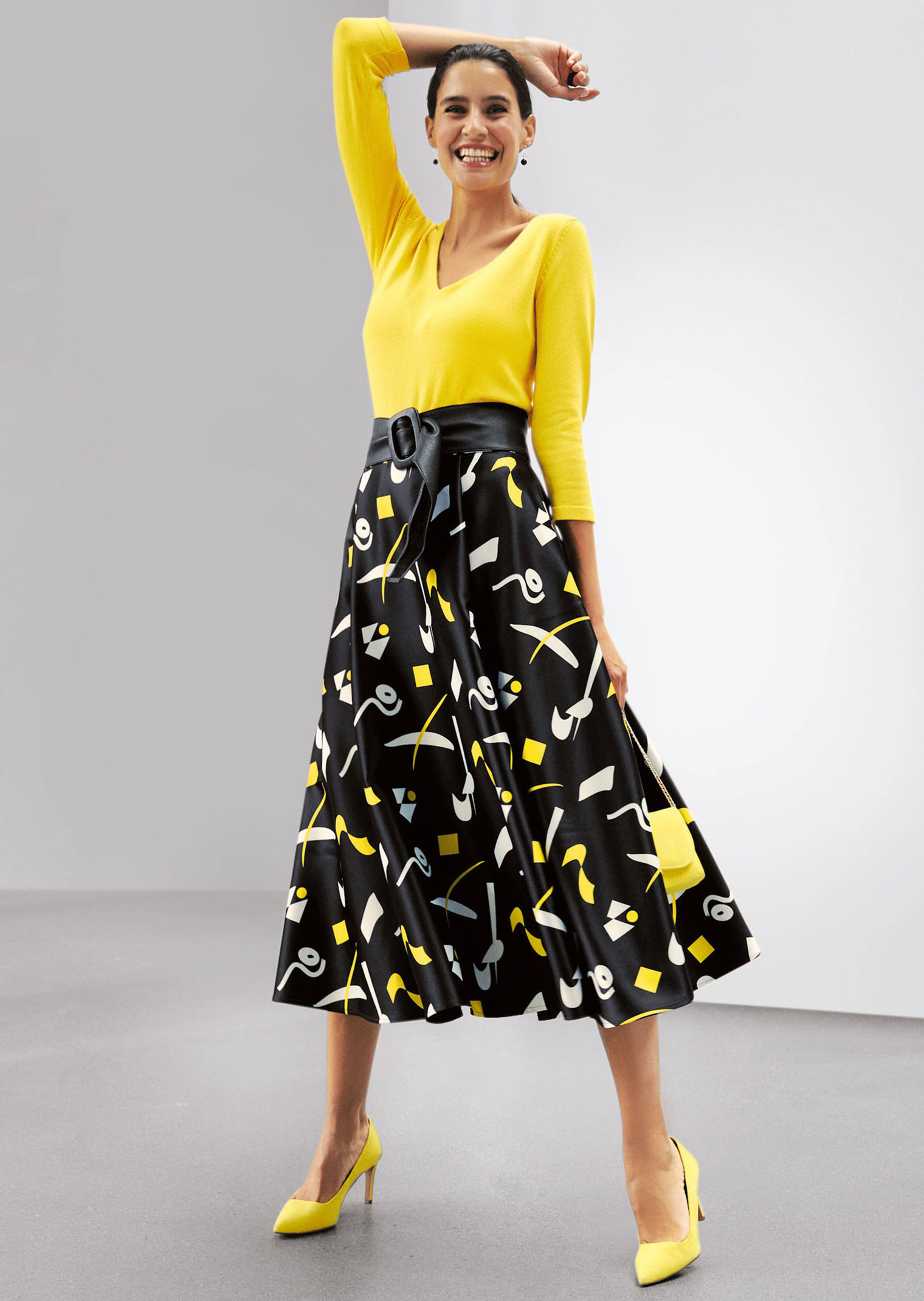 Ein Rock, der mit seinem Dessin den Trend setzt. Der ausgestellte Midirock mit viel Weite schwingt wunderschön bei jedem Schritt. Durch den starken Kontrast wirkt er so modern und lässt sich sowohl casual als auch elegant kombinieren. Ausgestattet ist er mit Formbund, Innenbundsicherung, Bundfalten, Seitenzipper und Nahttaschen. Dank Kurzgrößen können ihn auch kleine Frauen prima tragen.
