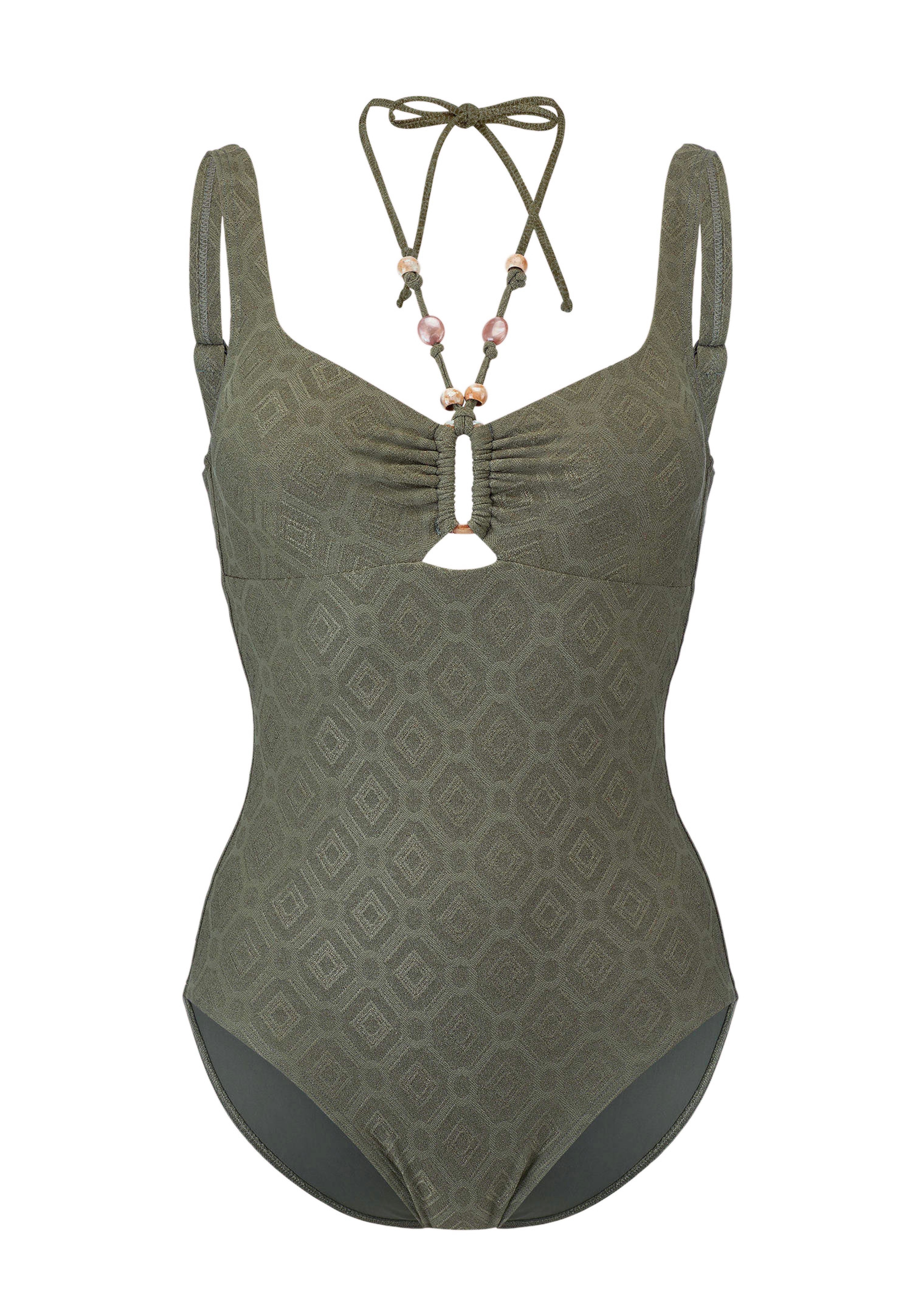 Das besondere Highlight dieses Badeanzugs ist der elegante Neckholder verziert mit edlen Holzperlen. Der Badeanzug aus grafischer Jacquardware ist bügellos und mit eingearbeiteten Softschalen ausgestattet, die für eine schöne Form und angenehmen Halt sorgen. Vollständig gefüttert bietet er optimalen Tragekomfort. Zusätzlich verstellbare Träger ermöglichen eine individuelle Anpassung, während das moderne Design am Strand oder Pool für einen eindrucksvollen Auftritt sorgt.