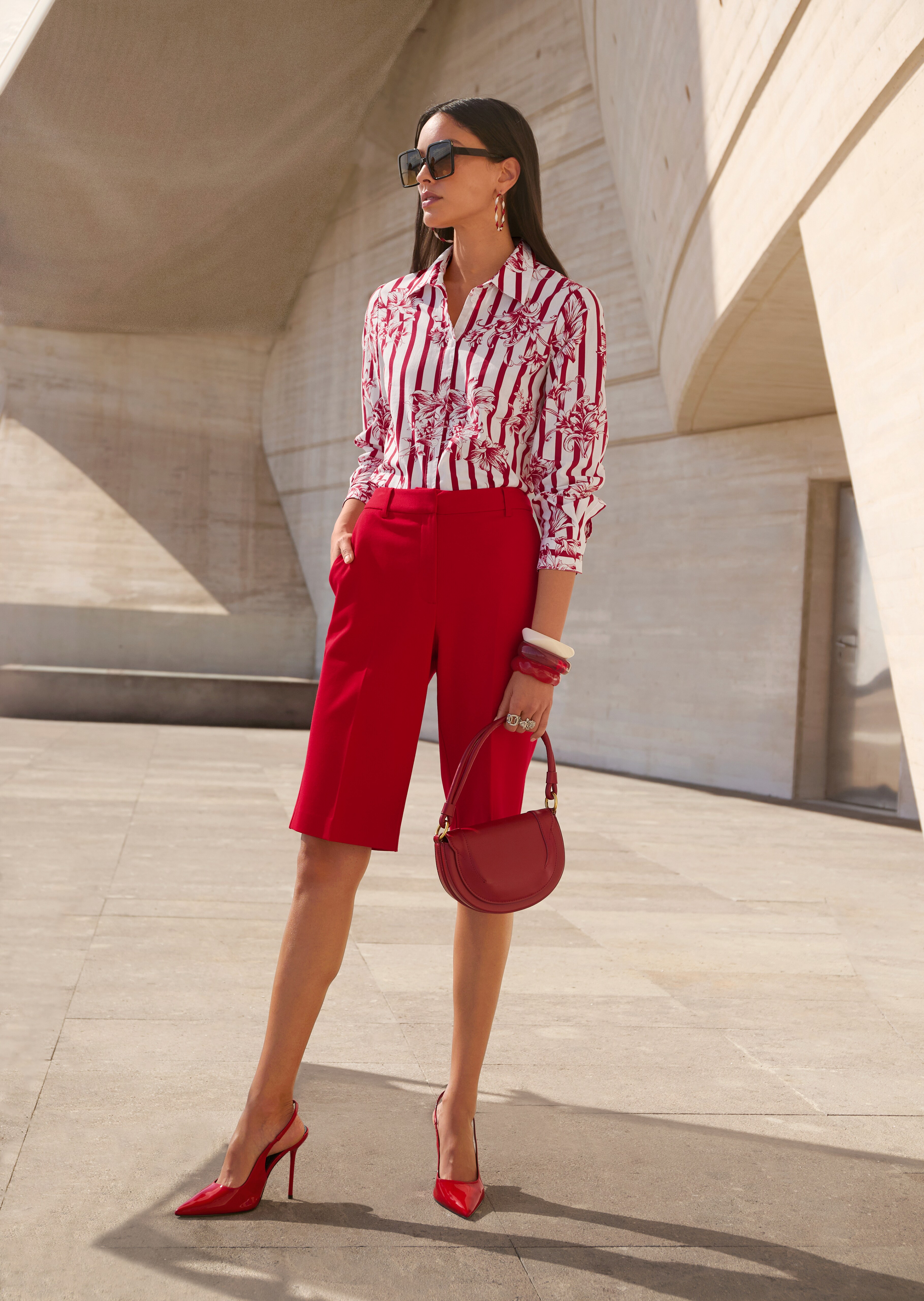 Bermudas feiern ihr Comeback als modernes Sommer-Basic. Dieses Modell zeigt, wie lässig und zugleich gepflegt die verkürzte Hosenform wirken kann. Der Bund mit Gürtelschlaufen, schräge Eingriffstaschen und die dezenten Bügelfalten verleihen ihr eine zeitlose Optik. Der softe Jersey mit Stretch sorgt für angenehmen Tragekomfort. Kombinieren Sie die Bermuda mit Bluse und Blazer für einen modischen Anzuglook oder mit Top und Sandalen für einen entspannten Weekendstyle.