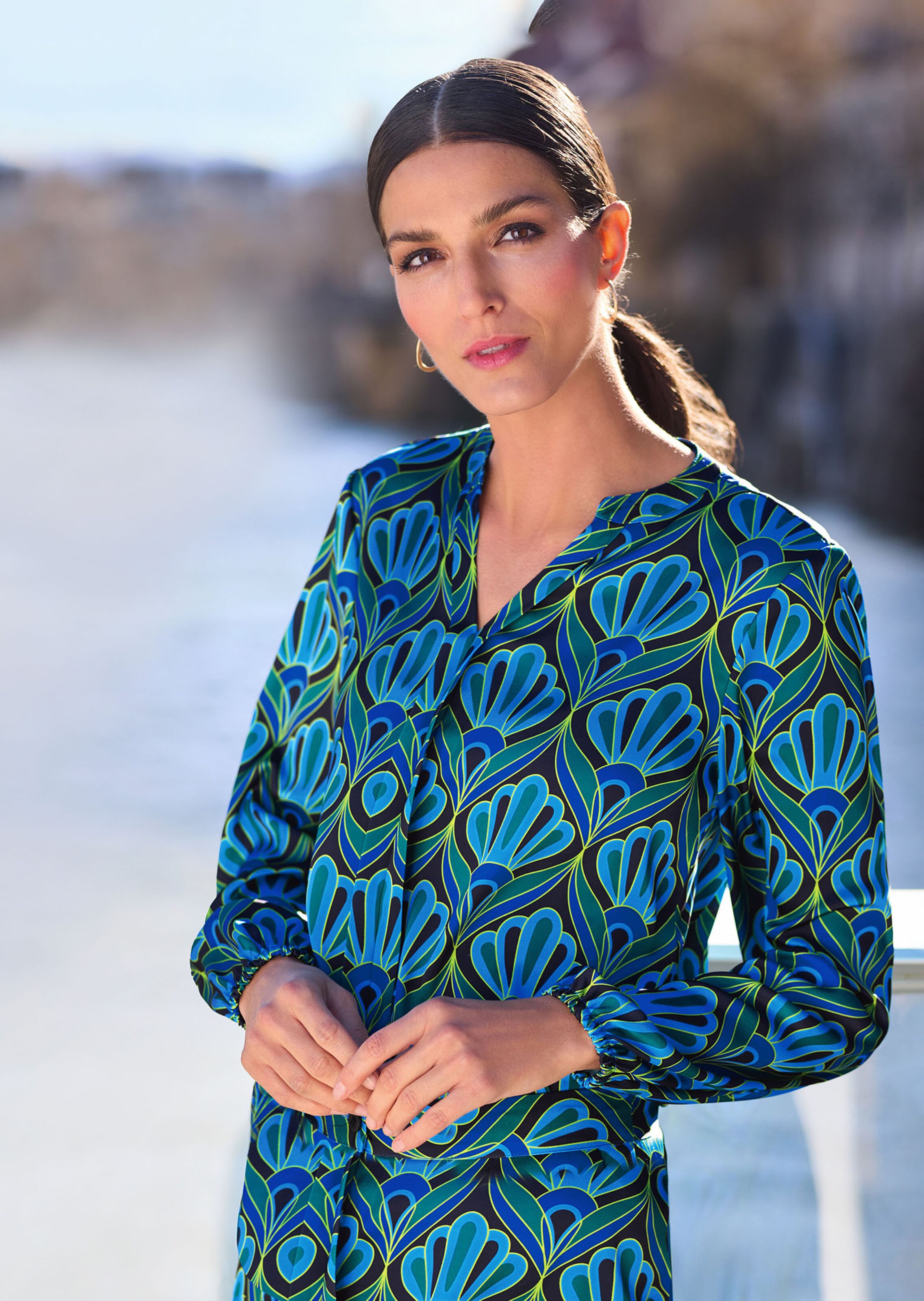 Fashionistas stellen ihr Trendgespür jetzt mit edlen Retro-Styles unter Beweis. Auch wir lieben den Look und haben diese Bluse mit leuchtendem Unikat-Print für Sie designt. Sie ist aus fein fließendem Jersey-Stretch leger geschnitten und hat einen V-förmigen Rundhalsausschnitt, lange Ärmel und Seitenschlitze.