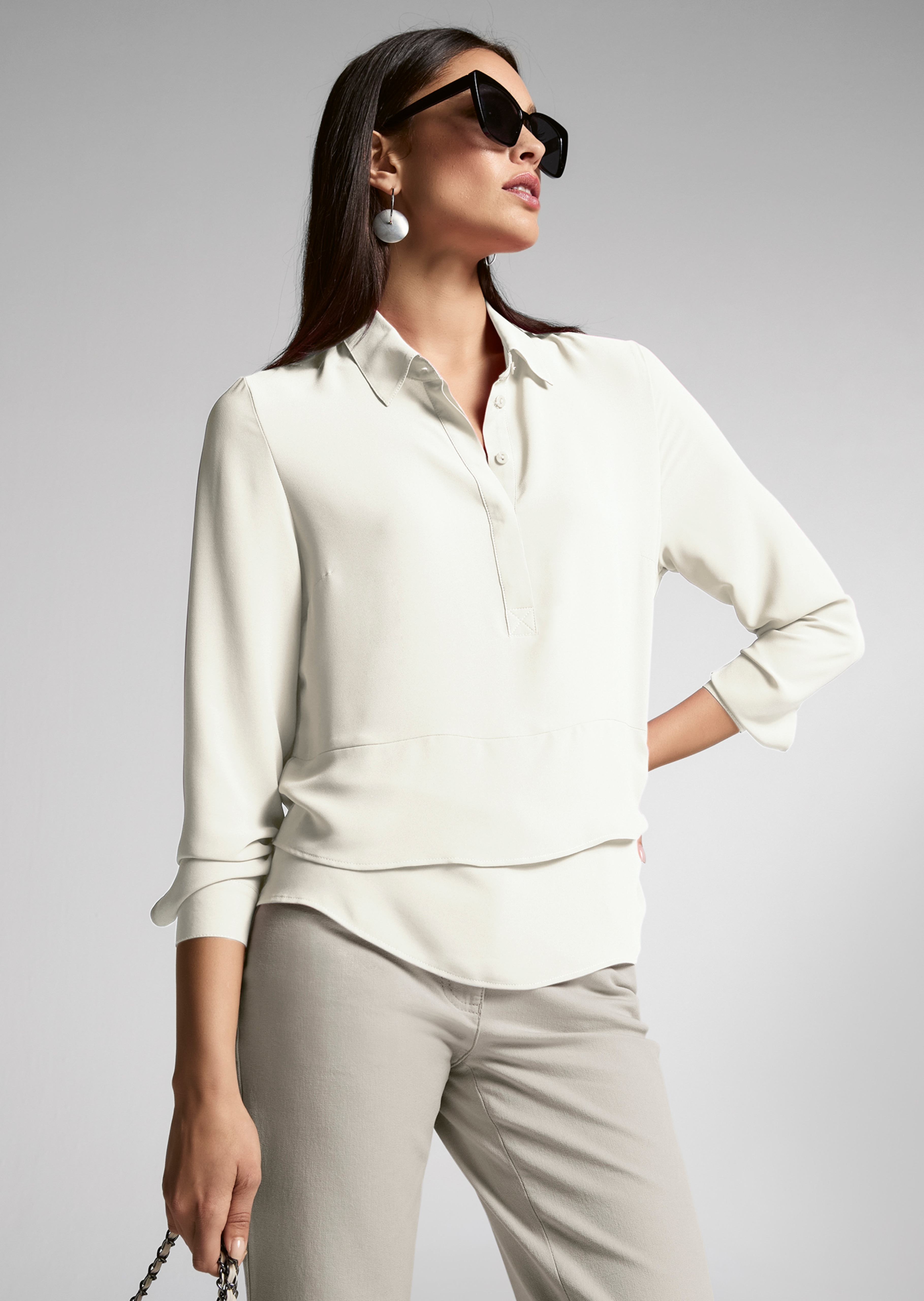 Entscheiden Sie sich für die feminine Bluse, die mit einer verdeckt gearbeiteten Knopfleiste bequem zum Schlüpfen ist. Klassische Manschettenärmel verleihen zeitlose Eleganz. Mit modischen Volants im Vorderteil