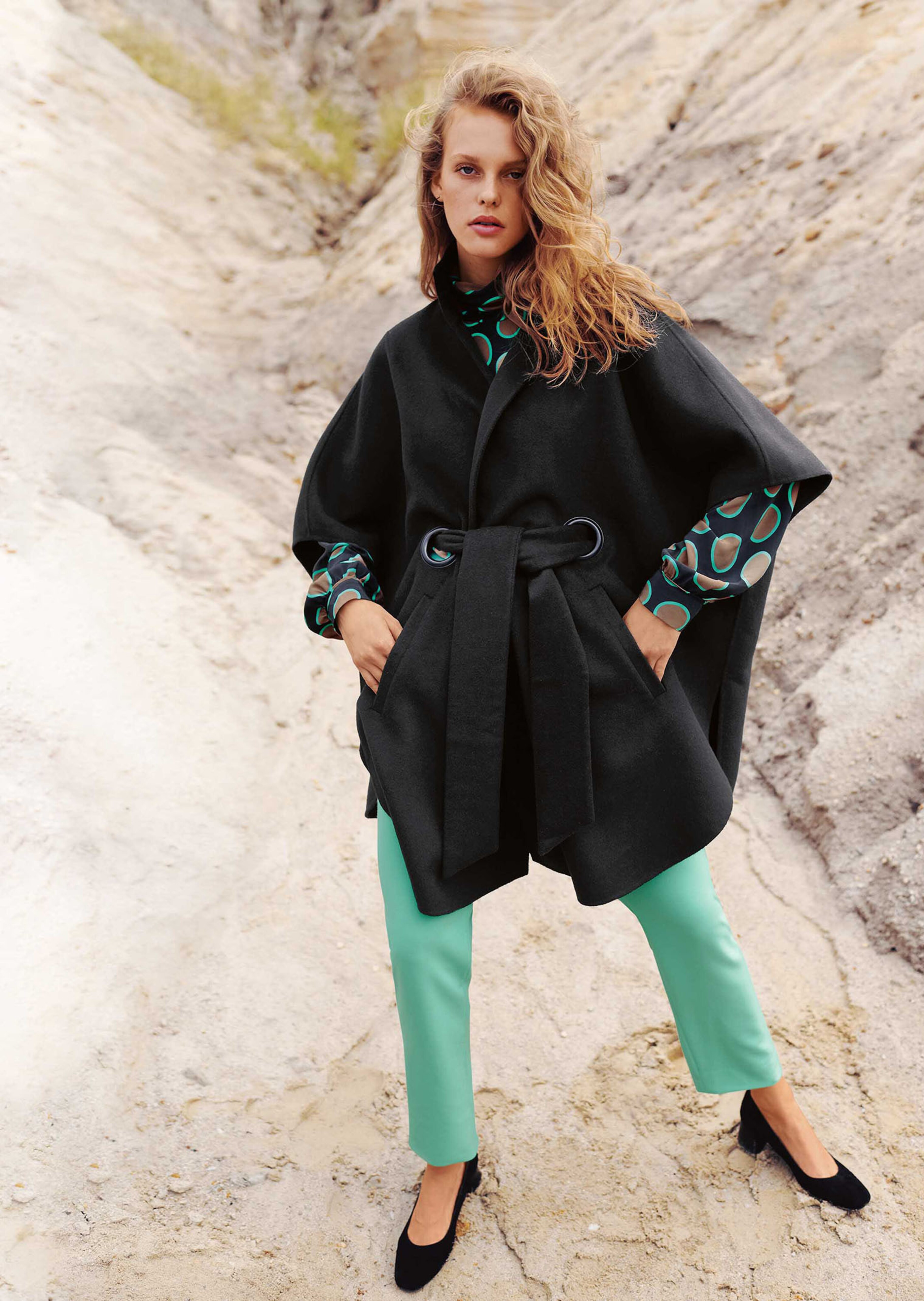 Weder zu warm noch zu kalt! Dieses coole Cape aus hochwertiger Doubleface-Qualität ist eine tolle Trendwahl, um die Übergangszeit modisch zu meistern. Wir stylen es officetauglich zum schicken Hosenanzug oder betont lässig mit dickgestricktem Pulli zu Jeans und Boots. Das Cape ist in legerer Weite verschlusslos gearbeitet und kann mit einem breiten Bindegürtel, der durch runde Ösen gezogen ist, auf Figur gebracht werden. Es hat einen modernen Stehkragen, der sich vorne überlappen lässt.