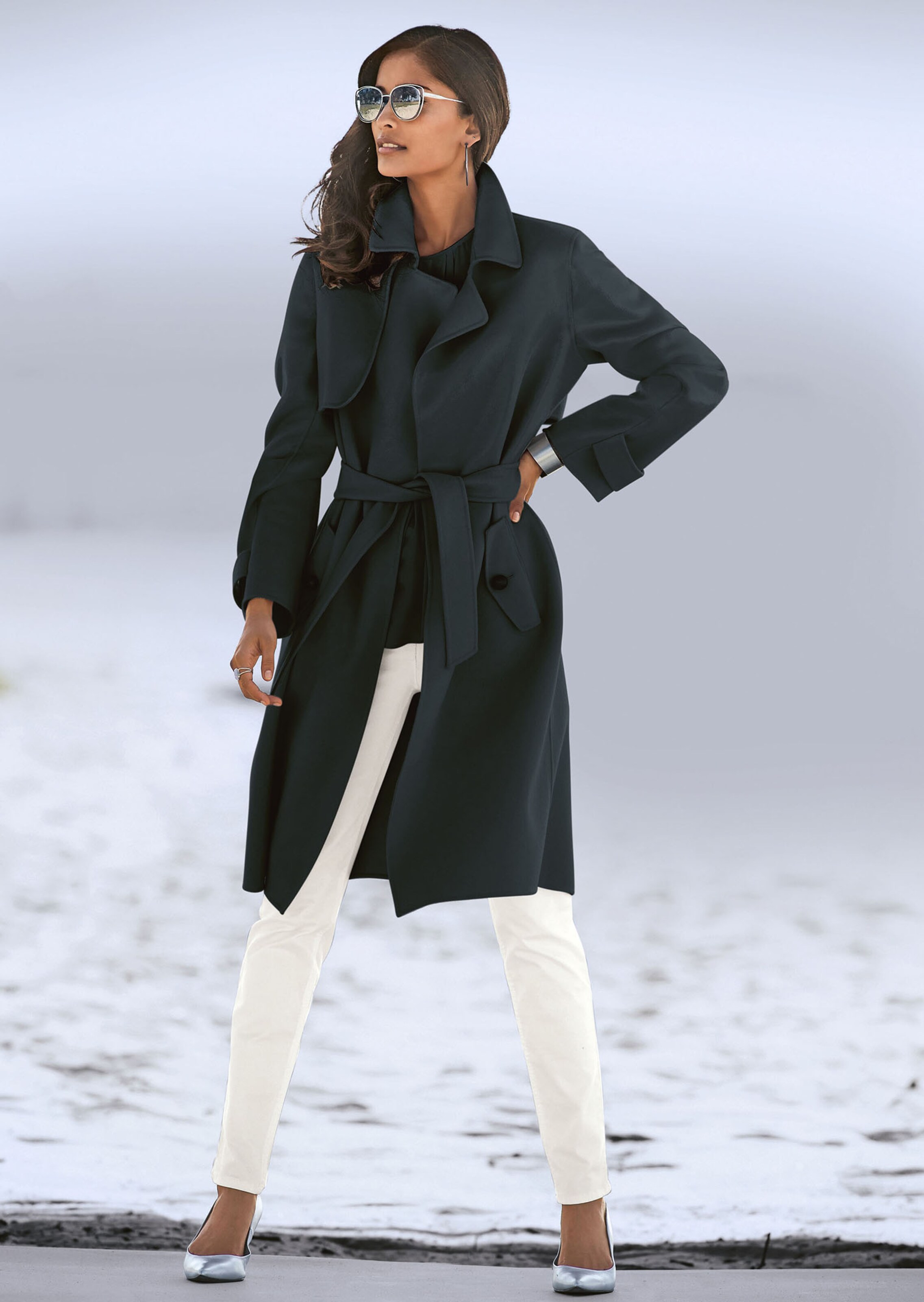 Ein neuer Auftritt für den klassischen Trench. In hochwertiger Doubleface-Qualität begeistert er nicht nur mit zwei schönen Seiten, er verwöhnt auch mit dem fantastischen Komfort naturreiner Wolle. So gibt er sich weich und leicht im Tragegefühl, geschmeidig im Fall und herrlich unkompliziert. Typisch verarbeitet zeigt sich der Kurzmantel mit Revers-Kragen, einem Vorder- und Rückenkoller, Paspel/Pattentaschen mit Knopf sowie Ärmelriegel mit Knopf. Ein Bindegürtel bringt die legere, verschlusslose Form auf Figur. Ein perfekter Begleiter für den sportlich eleganten Stil. Durch sein modernes Understatement harmoniert er mit vielen Looks aufs Edelste.