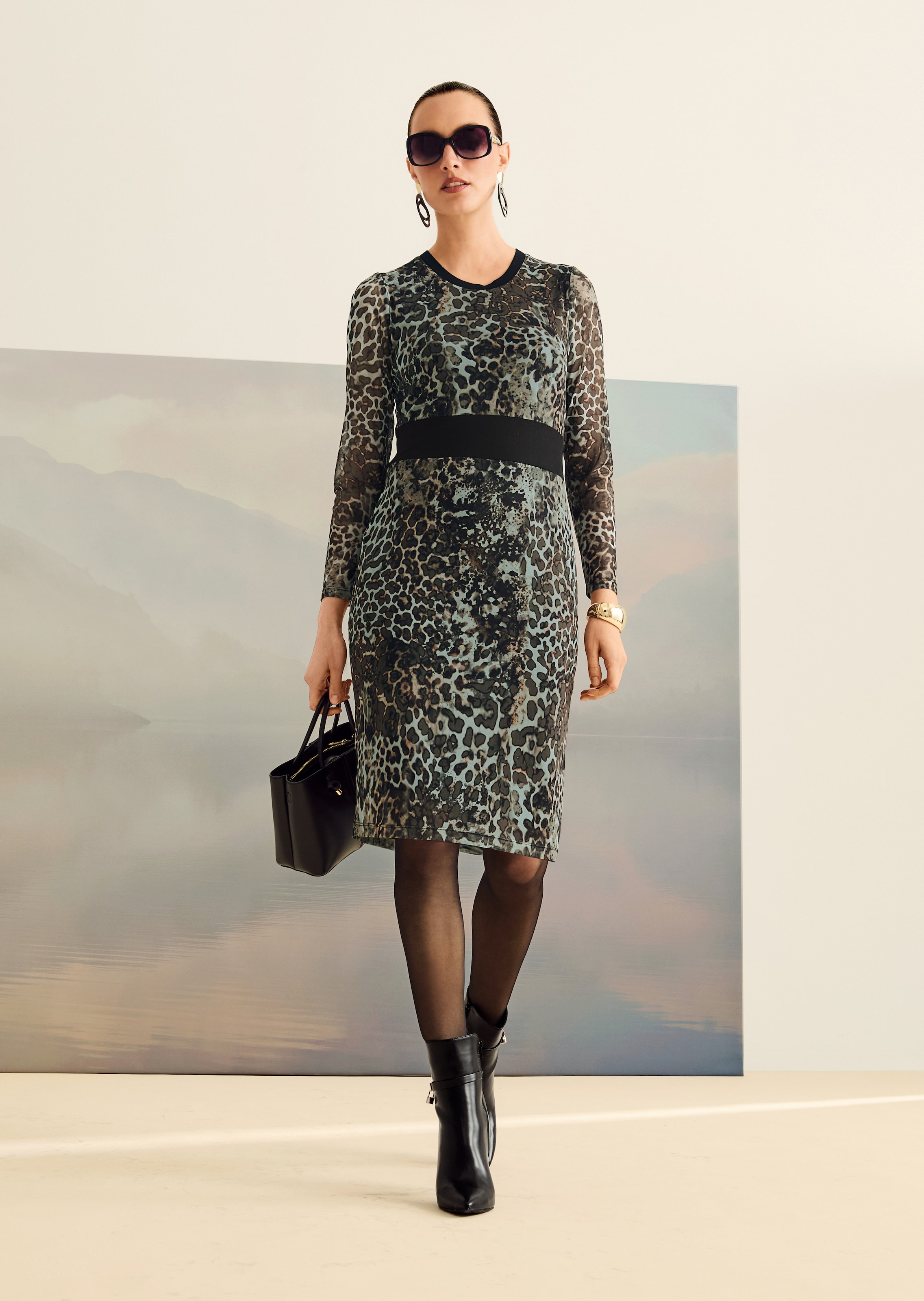 Ein echtes Mode-Statement – perfekt für stilbewusste Auftritte. Ein atemberaubend schönes Kleid – feminin, stilvoll und von eindrucksvoll modischer Raffinesse. Weich fließende Mesh-Qualität umschmeichelt sanft die Haut und sorgt für ein angenehmes, super komfortables Tragegefühl. Die figurbetonte Etui-Form setzt die weibliche Silhouette mit zurückhaltender Eleganz in Szene, während ausdrucksstarkes Animal-Design einen Hauch Extravaganz ins Spiel bringt. Unifarbene Blenden an Rundhals-Ausschnitt und Taille setzen stilvolle Akzente und betonen die femininen Proportionen auf schmeichelhafte Weise. Die zart transparente Qualität verleiht dem Kleid seine edle Leichtigkeit und wird durch das eingearbeitete Futter blickdicht. Lange, schlank geschnittene Ärmel runden das Design mit subtiler Eleganz ab und machen das Kleid zu einem vielseitigen Begleiter.