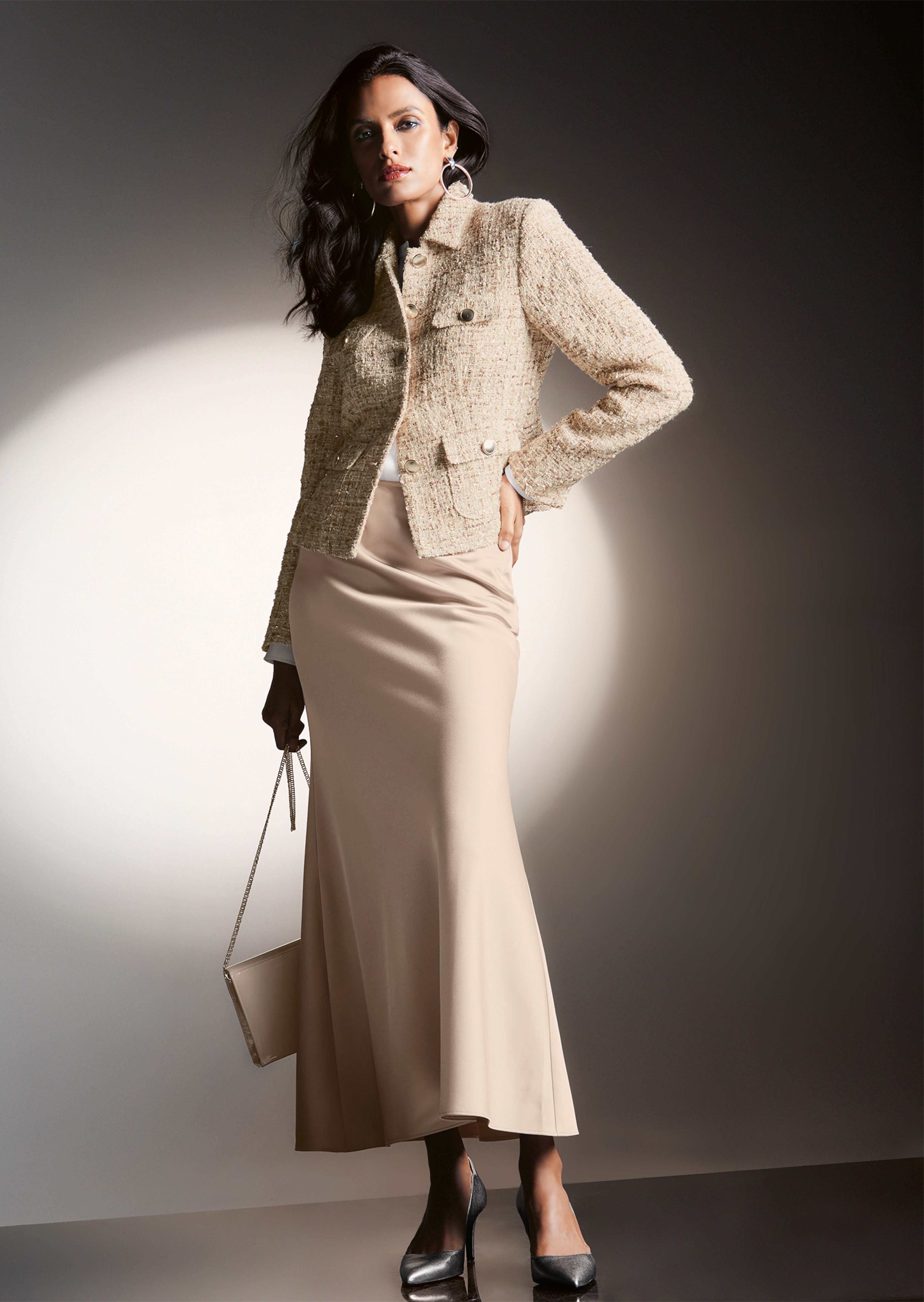 Eine festliche Blazer-Variante in hochwertiger Bouclé-Qualität, die durch eingearbeitete Pailletten aufregende Glanz-Effekte bietet. Metallisch schimmernde Knöpfe setzen die durchgehende Knopfleiste, beide Pattentaschen und die dekorativen Zierpatten im Brustbereich stilvoll in Szene. Die langen Ärmel mit Saumschlitzen können lässig umgeschlagen werden, was dem Blazer eine zusätzliche, modische Note verleiht. Ein edler Blazer, der sich perfekt für festliche Anlässe eignet und jedem Outfit eine Prise Glamour verleiht.