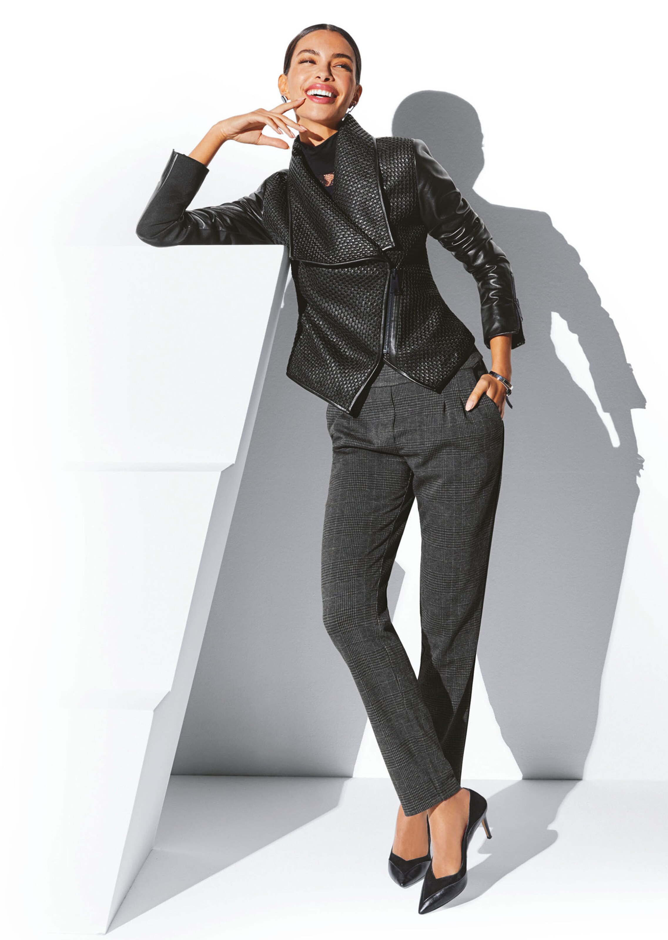 Elegante Hosen kommen jetzt sportiv und lässig daher. Die Glencheckhose mit Gesäßtaschen und elastischem Bund wirkt durch den knöchellangen, verschlusslosen Jogg-Pants-Style so trendy. Kunstleder akzentuiert die seitlichen Paspeln, Schubtaschen und Gürtelschlaufen. Kleine, vorderseitige Biesen mit aufspringenden Fältchen setzen den femininen Akzent. Der weiche Jersey ist formstabil und trägt sich angenehm. Durch zusätzliche Kurzgrößen können sie auch kleine Frauen prima tragen – im Büro oder zu privaten Anlässen.