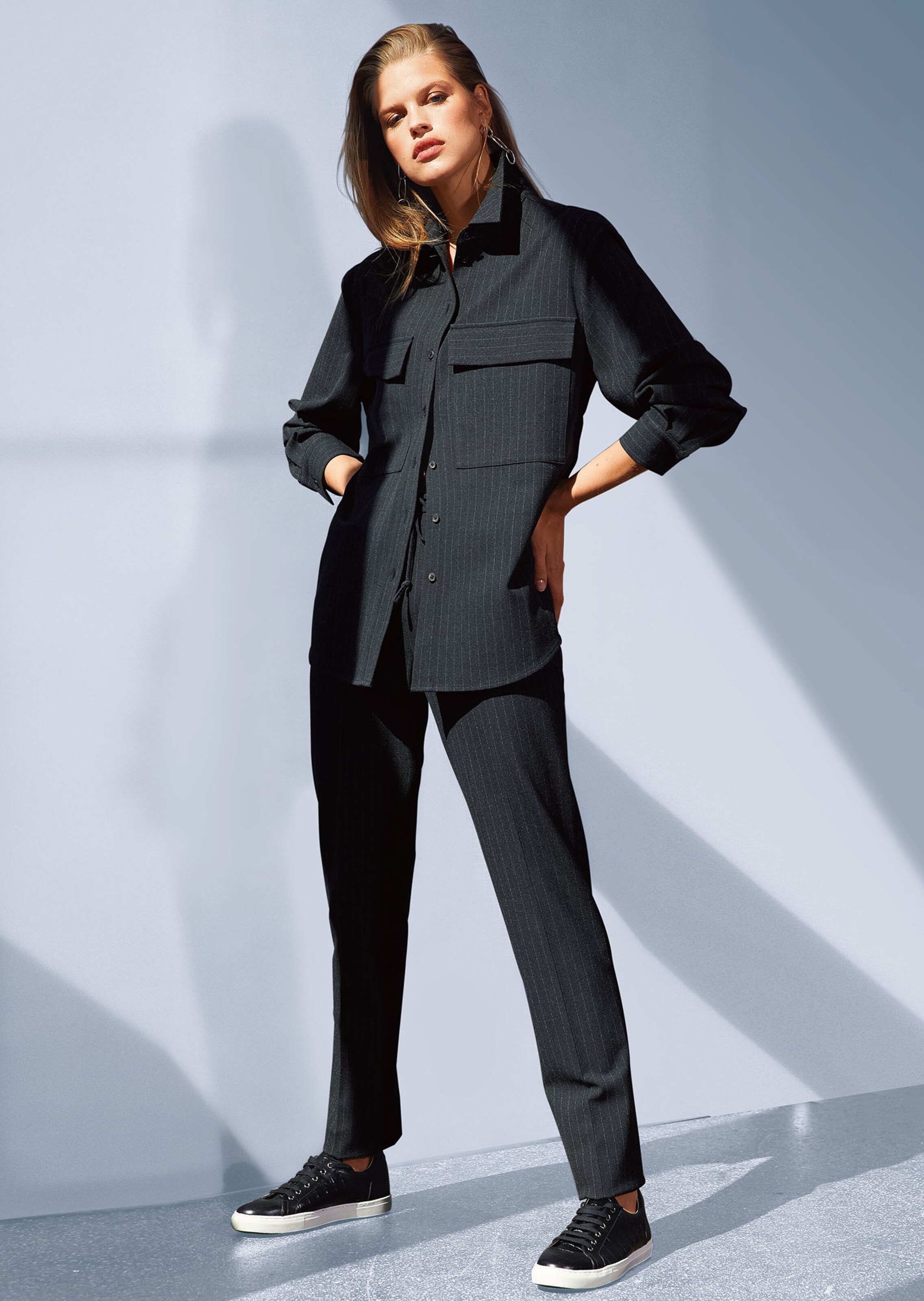 Ein Hemd in hochwertiger Verarbeitung, das auch als Jacke eine gute Figur abgibt. Die robuste Stretch-Qualität ist wertvoll im Griff und präsentiert sich in betont legerer, körperumspielender Länge. Modisch »oversized« lautet auch hier die Devise und sorgt bei jedem Auftritt für eine trendstarke Attitüde. Das edle Nadelstreifen-Muster bereichert den Lässig-Look mit stilvoller Note und bringt Spannung in die Kombination. Ein klassischer Hemdkragen, die überschnittene Schulterpartie, lange Ärmel mit Knopfmanschette und eine durchgehende Knopfleiste sind State of the Art. Ergänzt wird der Look von einer rückseitigen Passe mit angesetzter Kellerfalte. Aufgesetzte Pattentaschen und eine leicht gerundete Saumlinie unterstreichen die lässige DNA des Styling-Partners und bieten Stauraum. Hochwertige, französische Nähte verleihen dem Modepartner eine exklusive Note und beweisen viel Liebe zum Detail. Ab Größe 42 sorgen Brustabnäher für eine optimale Passform.