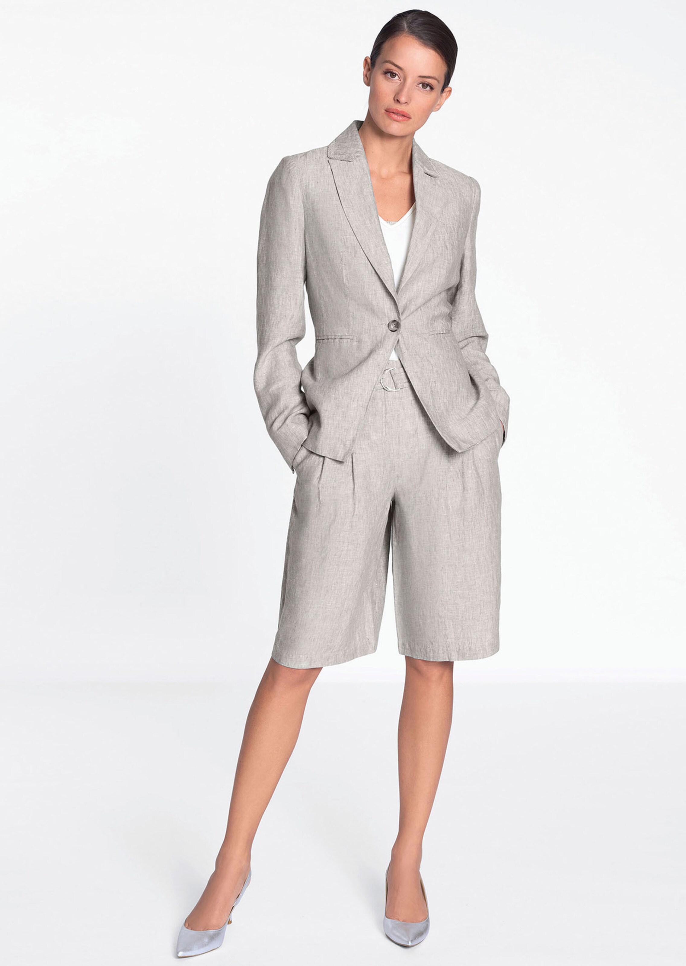 Die Bermuda ist eine lässige Trend-Alternative zum Rock. Vor allem, wenn sie sich so modisch und stilsicher präsentiert wie dieses Modell. Im angesagten Highwaist-Stil zeigt sich die Hose mit legerer Beinweite, Bundfalten, Nahttaschen und angedeuteten Gesäßleistentaschen. Auf einen separaten Gürtel dürfen Sie hier verzichten. Denn der angeschnittene Bund ist mit integriertem Gürtel, Gürtelschlaufen und feiner silberfarbener Zierkette gestaltet und setzt so die Taille dekorativ in den Fokus. Die hochwertige Leinenqualität ist ideal für den Sommer und sorgt für ein Tragefeeling mit luftig leichtem Komfort. Ein fantastischer Partner für unbeschwerte und dennoch stilbewusste City-Auftritte – mit unserem materialgleichen Blazer ergibt sich ein perfekter Sommer-Anzug.