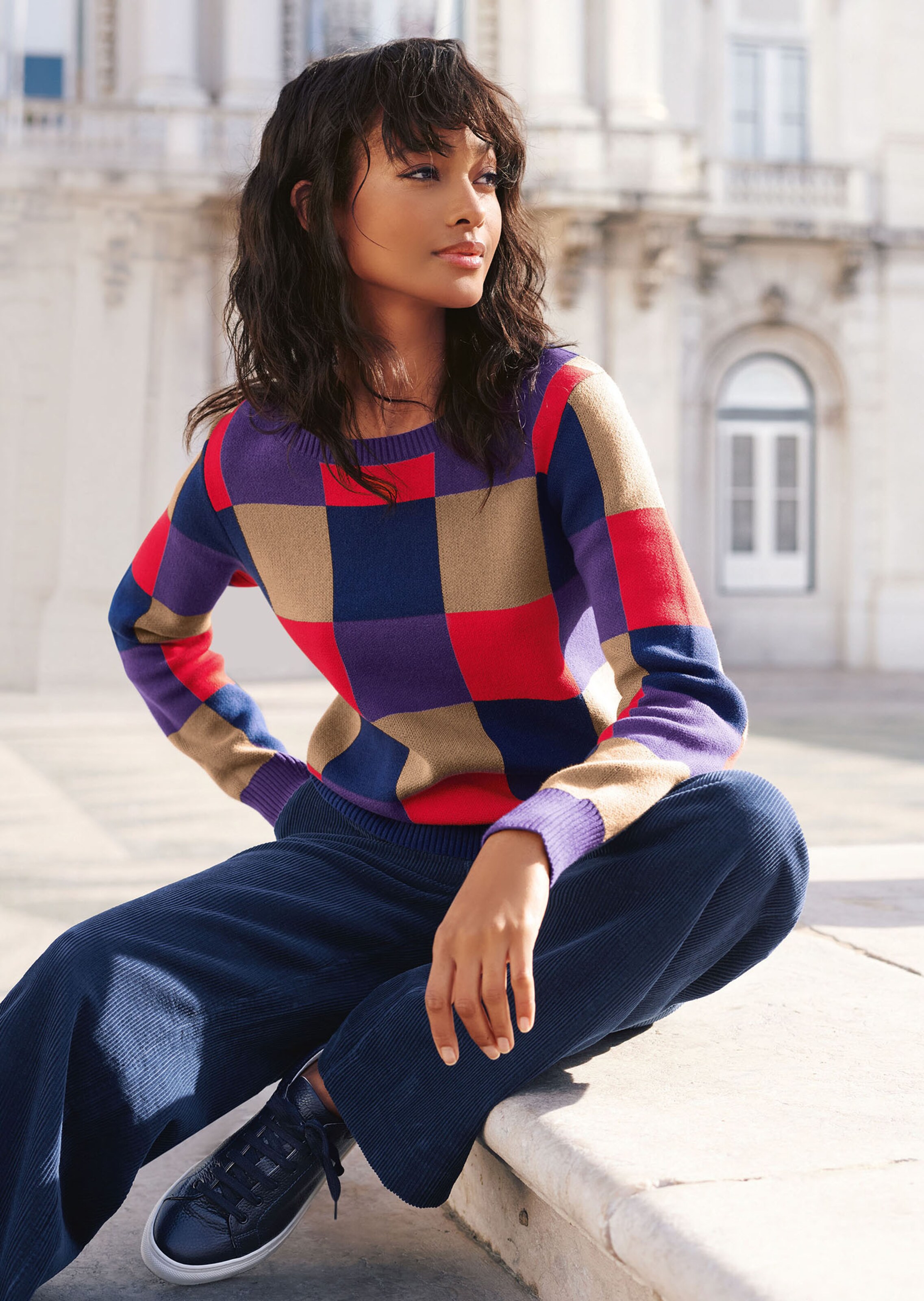 Karos trumpfen immer und überall. Wir haben dem Muster-Klassiker ein Makeover verpasst und es im coolen Colour Blocking auf einem Baumwoll-Pulli inszeniert. Der formgestrickte Pullover ist gerade geschnitten, hat einen runden Halsausschnitt, lange Ärmel und formstabile Rippstrickabschlüsse. Tipp: Den passenden Schal haben wir für Sie gleich mit designt!