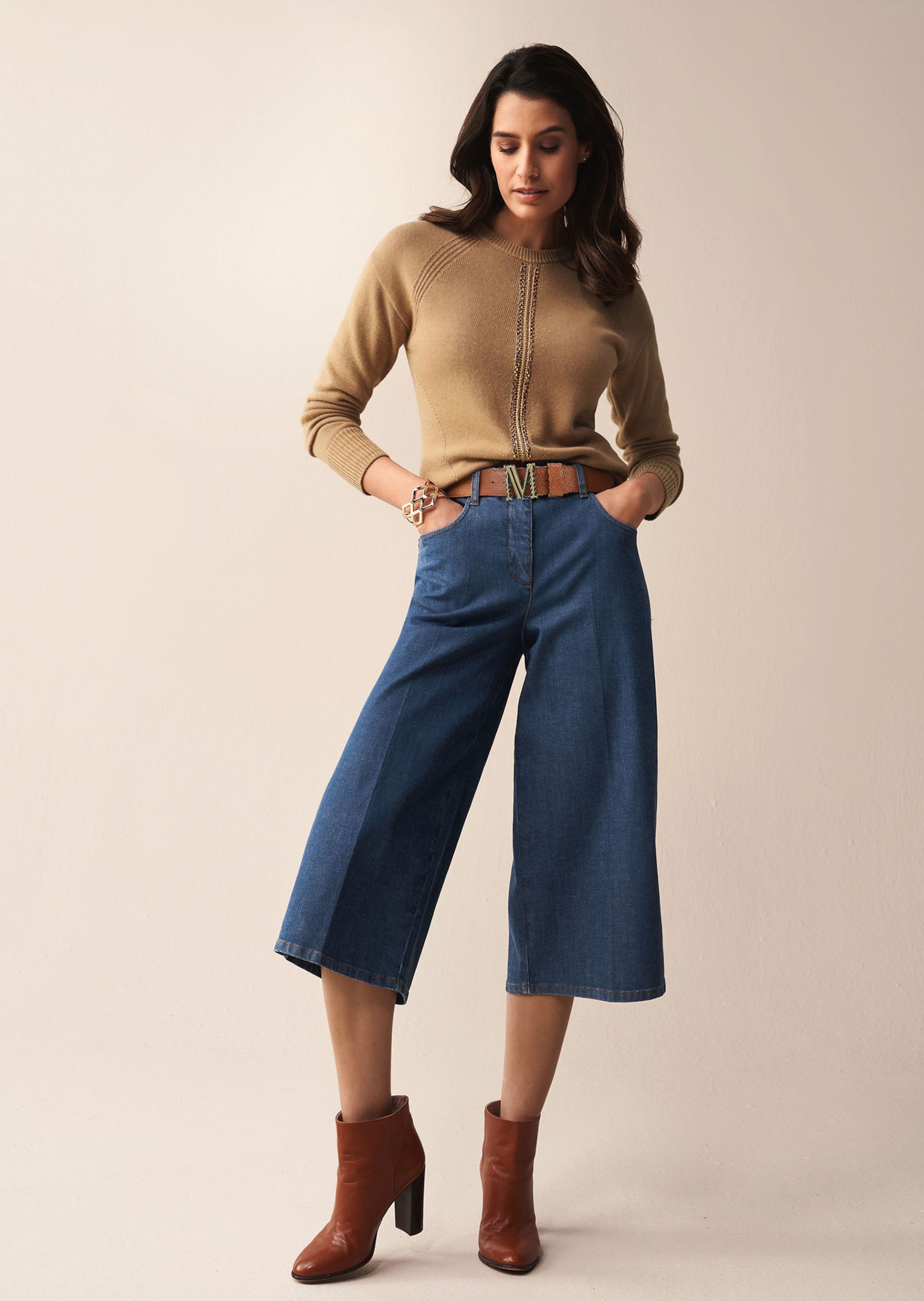 Denims können auch trendy und müssen nicht immer nur klassisch und leger daherkommen! Die beliebte Qualität gibt sich ausgesprochen modisch und präsentiert sich hier in angesagter Culotte-Form. Wadenlang und in charakteristischer Weite umspielt sie elegant das Bein und sorgt dank Stretch-Anteil für jede Menge Komfort. Der Formbund mit Gürtelschlaufen sitzt bequem auf der Hüfte. Zusammen mit der rückseitigen Passe verleiht er der Hose eine optimale Passform. Die authentische Five-Pocket-Verarbeitung erhält durch beidseitige Bügelfalten ihren gepflegten Feinschliff. Abgerundet wird der Style von einem original Logo-Knopf, kleinen Logo-Nieten und einem rückseitigen M-Jeans-Label aus Leder-Imitat. Sie verraten die Herkunft Ihres Modepartners und zeugen von viel Liebe zum Detail. Die Verarbeitung in Kurzgrößen wird auch den Ansprüchen etwas kleinerer Frauen gerecht.