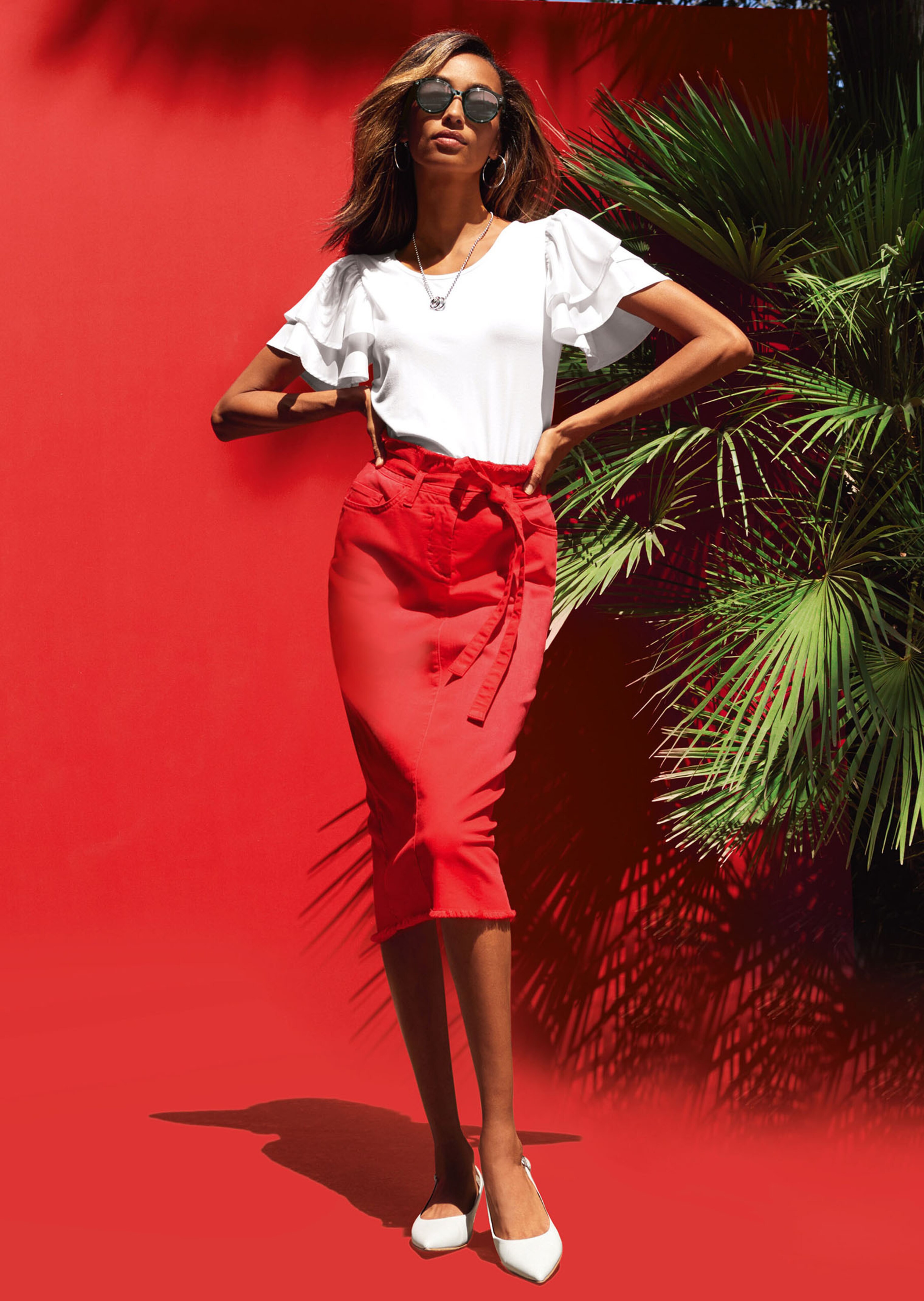 Hier setzen die Details den Trend! Der Jeansrock mit Fransen hat für die angesagte Silhouette einen erhöhten Bund. Feine Fransen akzentuieren sowohl den Bund als auch den Saum. Der Cottonstretch trägt sich angenehm. Wir haben den engen Rock für einen modernen Look mit MADELEINE Logoknopf, Reißverschluss, Gürtelschlaufen, Münztasche, rückseitiger Passe, aufgesetzten Taschen, rückseitigem Gehschlitz und Bindeband gestaltet. Die angesagte Farbe können Sie gut zu strahlendem Weiß kombinieren – für einen frischen, sommerlichen Look.