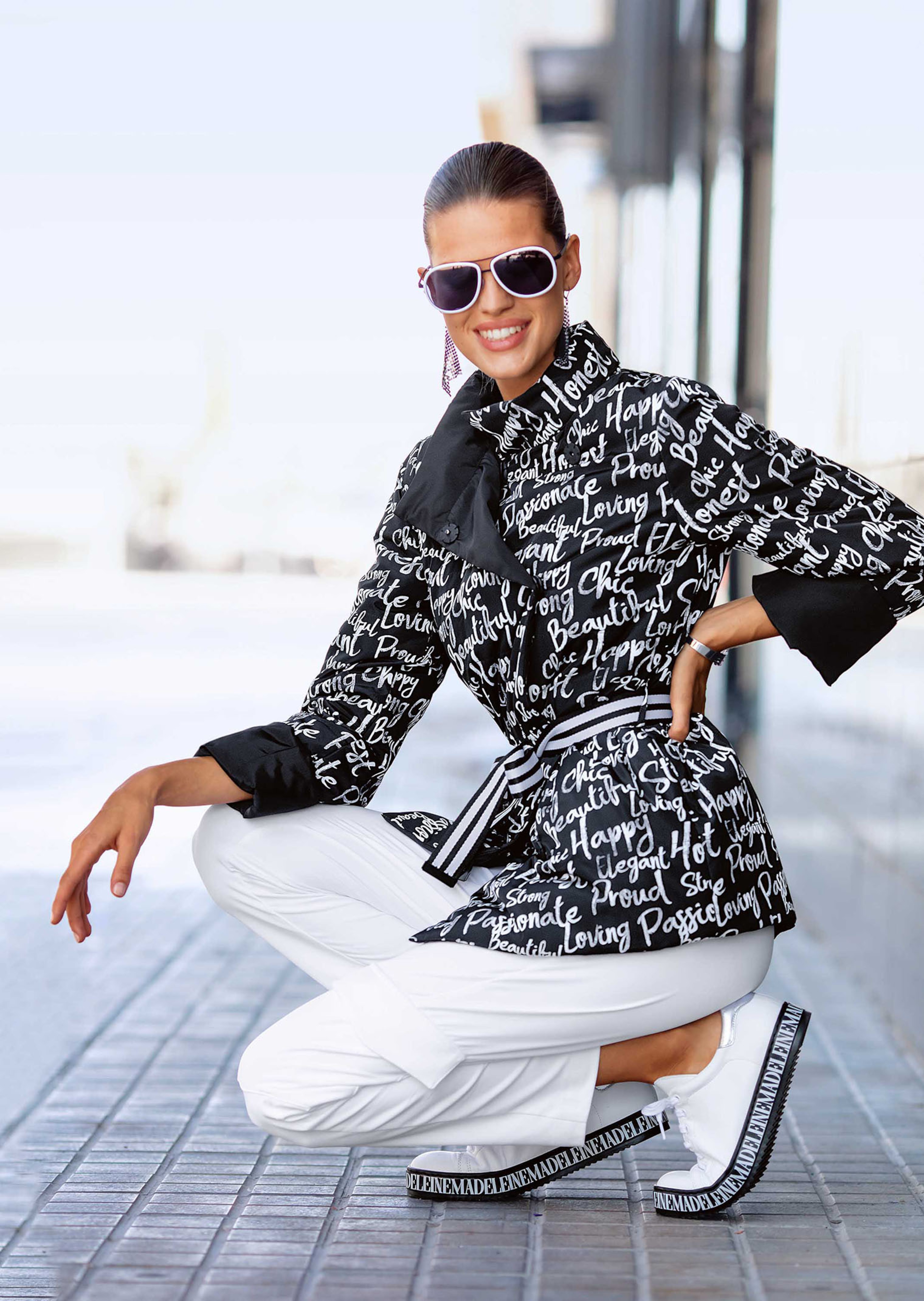 LOVE MY DAY – ein Statement, das Ihnen mit dieser Hose bestimmt gelingt. In verkürzter Form und bequemer, formstabiler Jersey-Qualität repräsentiert die Hose eine selbstverständliche Eleganz, die sie zum Liebling entspannter City-Auftritte macht. Der kontrastfarbene Stretchgürtel mit Letterprint wird dabei zum modischen Styling-Extra. Gepflegt im Look zeigt sich die Jerseyhose mit schmal verlaufendem Bein, Bügelfalten, schrägen Schubtaschen vorne und seitlich aufgesetzter Pattentasche am Bein. Der Formbund ist mit Gürtelschlaufen, Hakenverschluss und Innenbundsicherung gestaltet und sorgt für einen guten Sitz.