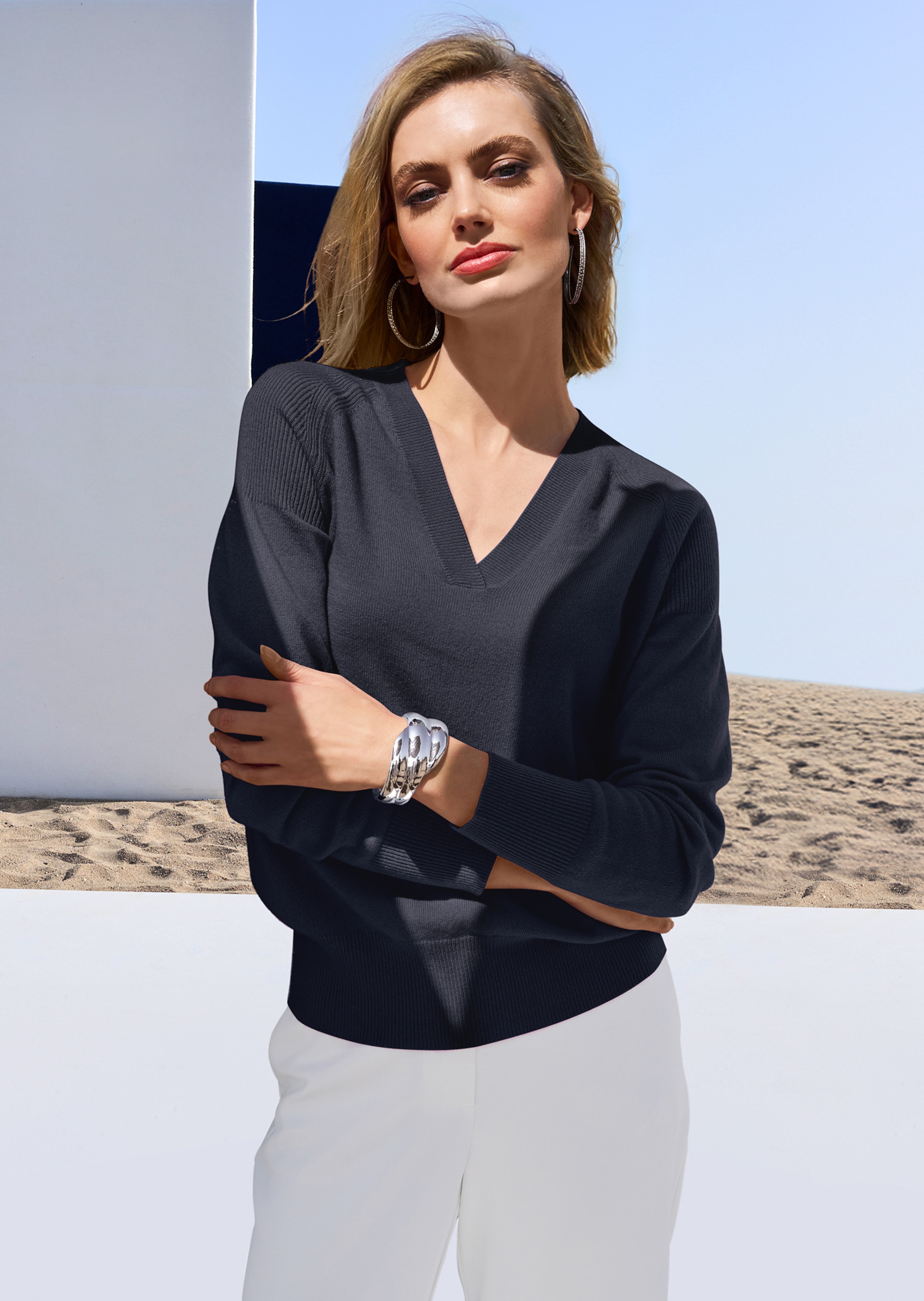 First Class-Strick für viele Gelegenheiten. Das flauschig weiche Tragevergnügen und die wunderbare Leichtigkeit sind das Geheimnis der feinen Kaschmir-Qualität – zweifädig versponnen schenkt sie ein besonders edles Maschenbild. Ein Wohlfühlerlebnis der exklusiven Art! Perfekt für einen edlen Basic-Pullover, an dem Sie bestimmt länger als eine Saison Ihre Freude haben werden. Mit feinen Rippstrick-Partien auf der Schulter sorgt der Pullover auch modisch für das gewisse Etwas. Aufwendig in Form gestrickt zeigt er sich in moderner, lässiger Weite und ist mit überschnittener Schulter, V-Ausschnitt und gerippten Abschlüssen gestaltet.