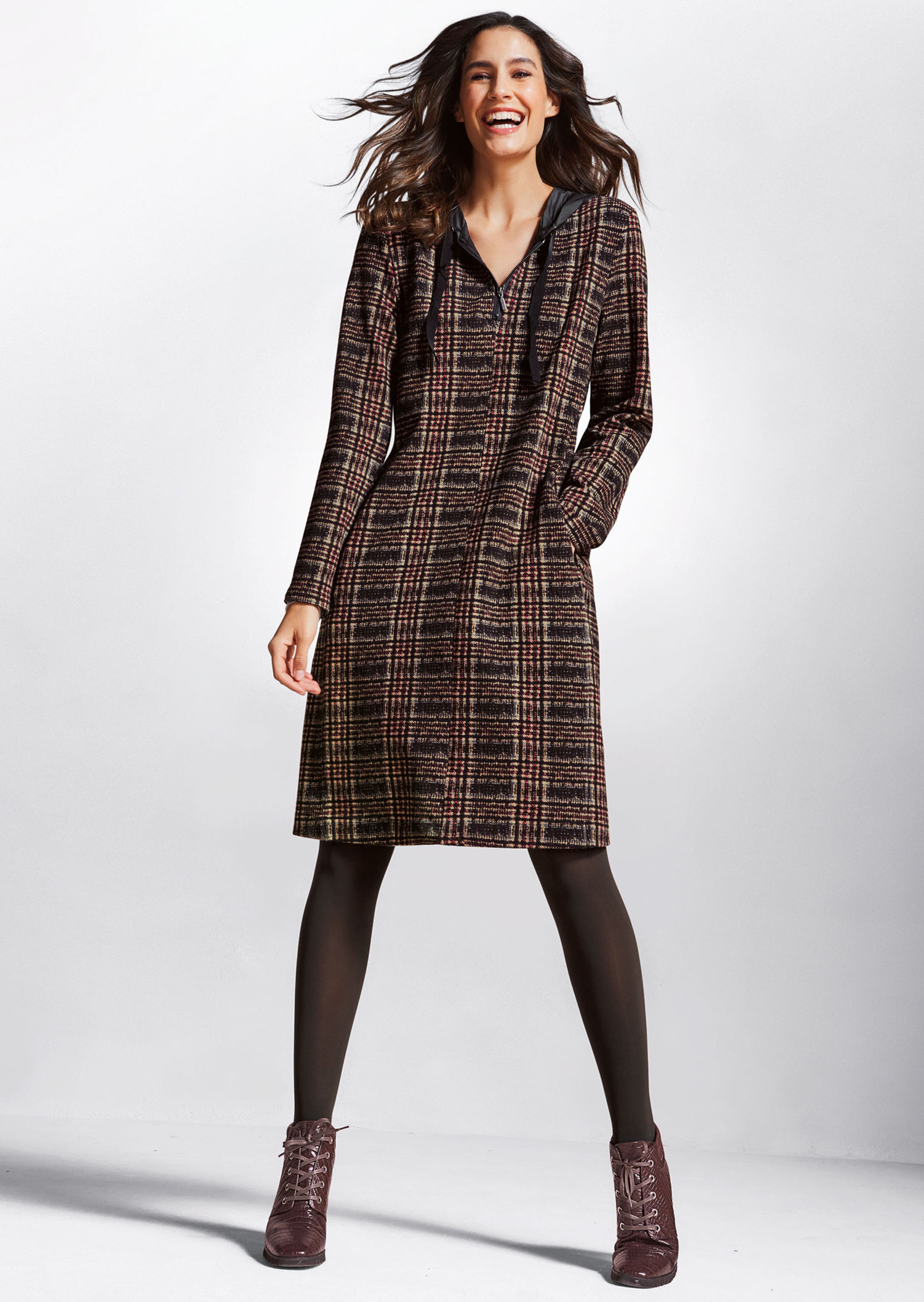 Ein Kleid, das mit seinem lässigen Schnitt und seinem Dessin ein Statement setzt. Das Kleid mit Kapuze umspielt leger die Figur. Durch seinen angesagten, bequemen Hoodie-Look bietet es sich perfekt auch für zuhause an. Der lässige, ungefütterte Style ist mit Langarm, überschnittenen Schultern, Brustabnähern ab Größe 40, Zipper am Ausschnitt und Kapuze mit Tunnelzug und Kordel gestaltet. Ein Kleid, das Sie im Handumdrehen trendy gestylt sein lässt.