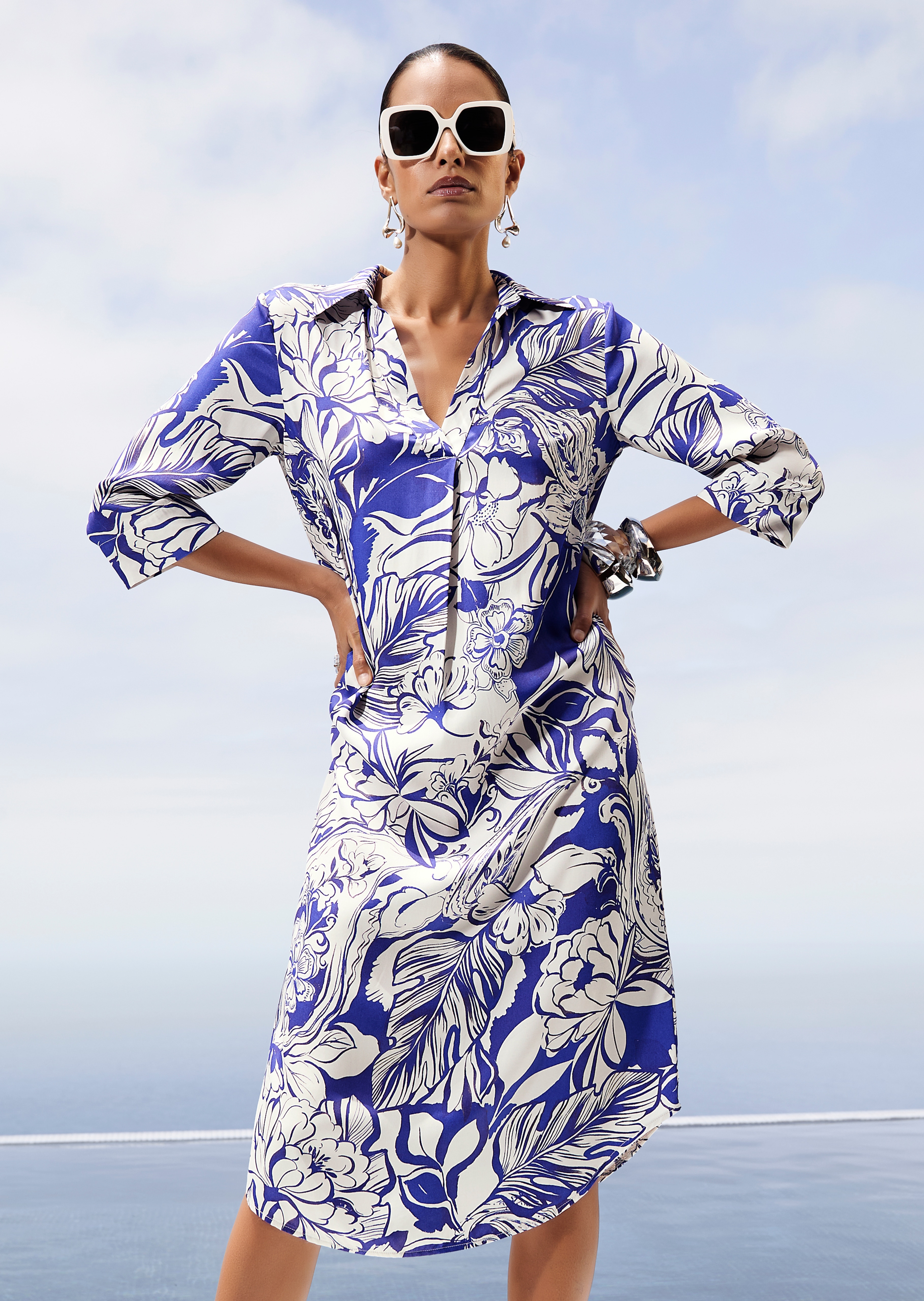 Unser Muster-Favorit für den Sommer, der jeder Frau in jedem Alter steht: farbenfrohe Blumen- und Blütendrucke. Dieses locker geschnittene Kleid in Schlupfform punktet mit Kragen, V-Blende und gerundetem Saum. Die gelegte Falte im Vorderteil und die Rückenpasse sorgen für bequeme Weite. 3/4-Ćrmel mit breitem Umschlag und Seitennahttaschen unterstreichen den entspannten Charakter.