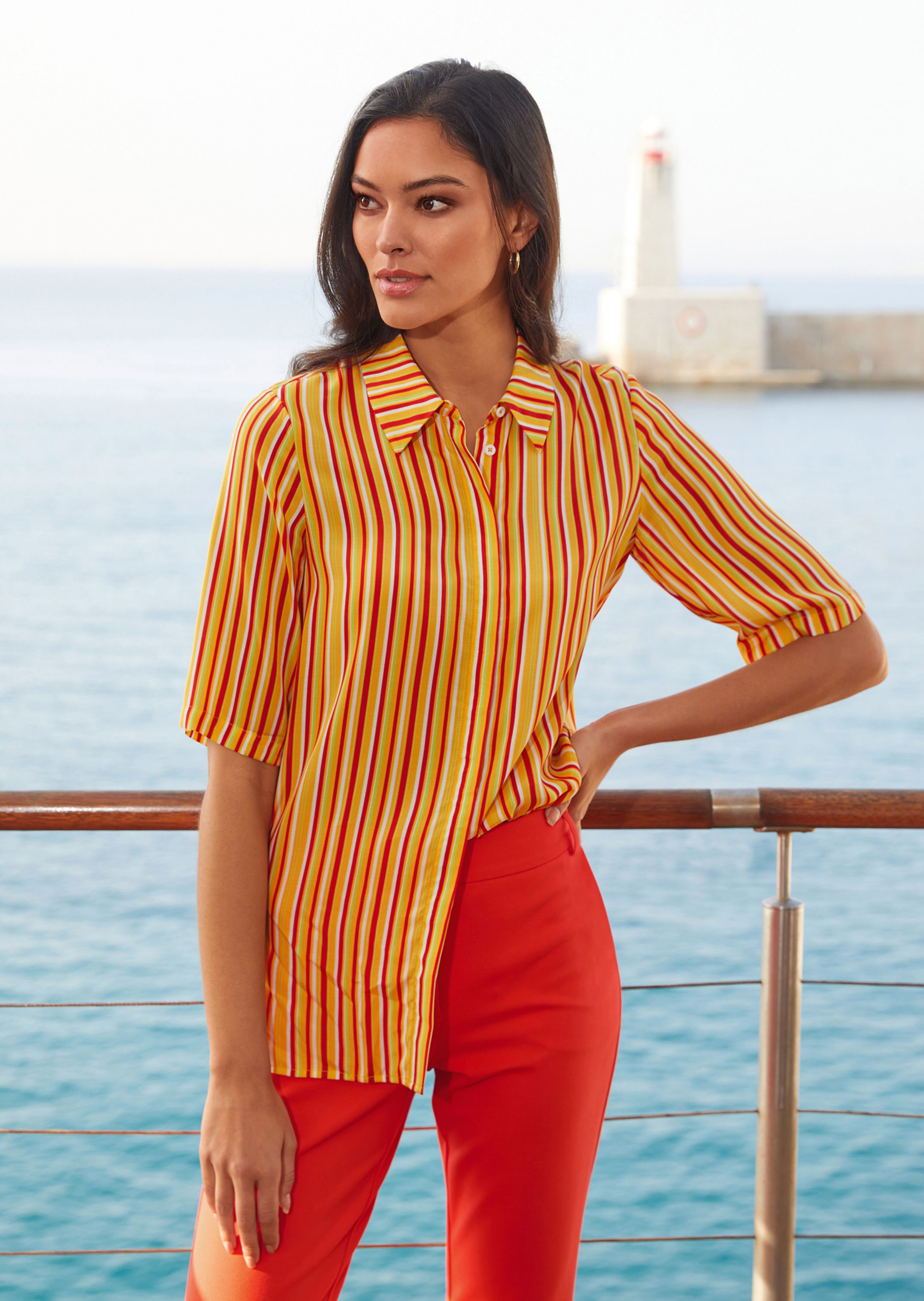Strahlender Streifen-Print bringt jede Menge Gute-Laune-Feeling in den Alltag und liegt absolut im Trend. Die weich fließende Viskose-Qualität der Kurzarm-Bluse ist angenehm kühl auf der Haut und ideal für angesagte Casual-Looks. Ihre durchgehende Knopfleiste ist verdeckt gearbeitet und schließt mit einem klassischen Hemdkragen ab. Gerade H-Form mit seitlichen Nahtschlitzen.