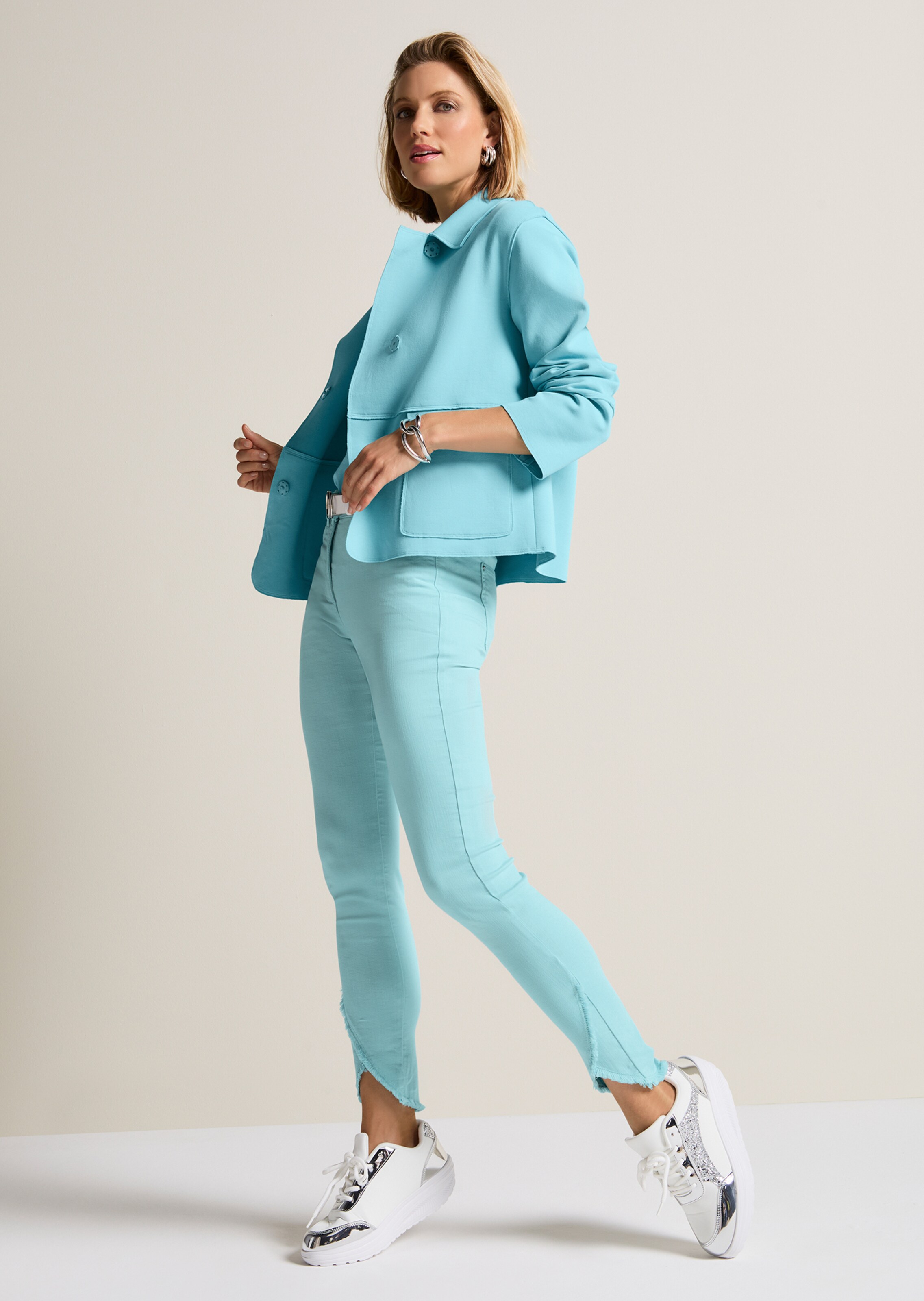 Offene Schnittkanten und die kurze, kastige Boxyform verleihen dem Blazer seine Modernität und jedem Look ein stylisches Finish. Die weiche Stretch-Qualität ist angenehm im Trage-Gefühl und macht jede Bewegung mit. Ein klassischer Hemdkragen, die einreihige Knopfleiste mit farblich passenden Knöpfen und aufgesetzte Taschen mit Patte runden das Lieblingsstück stilsicher ab.