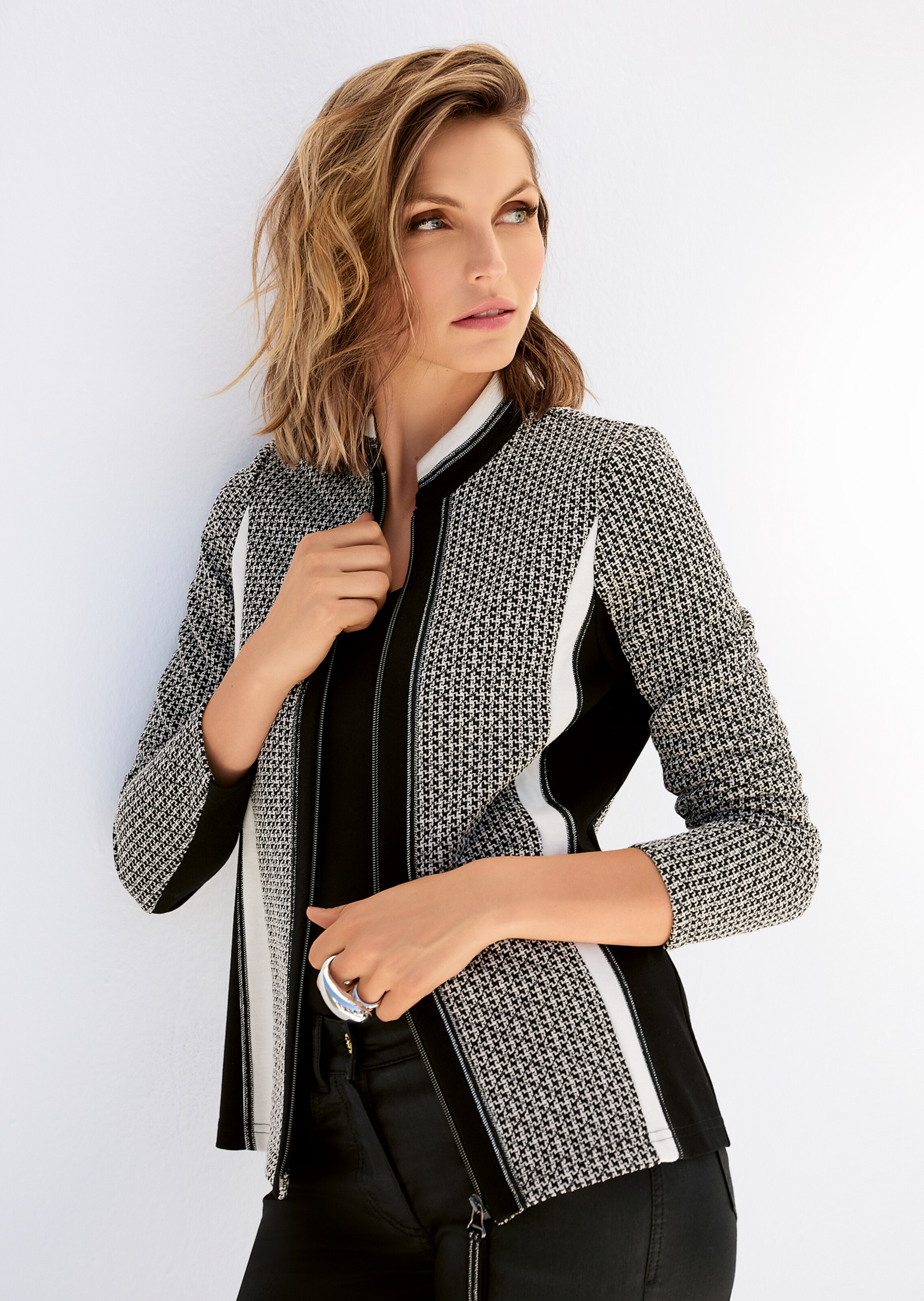 Wenn Sie Blazer lieben, gerne aber auch mit einer Prise Extravaganz überzeugen, sind Sie hier genau richtig. Die langƤrmelige Form geht modisch neue Wege und schenkt Ihrem Look eine stylische Note. Elastischer Jersey ist sehr bequem und zeigt sich hier in aufregend schƶnem Minimal-Dessin. Mit Stehkragen und sportivem Front-ReiĆverschluss verlƤsst er die klassische Linie und setzt neuen Akzente. Dekorative ZiernƤhte und eingearbeitete Taschen machen den Look komplett.