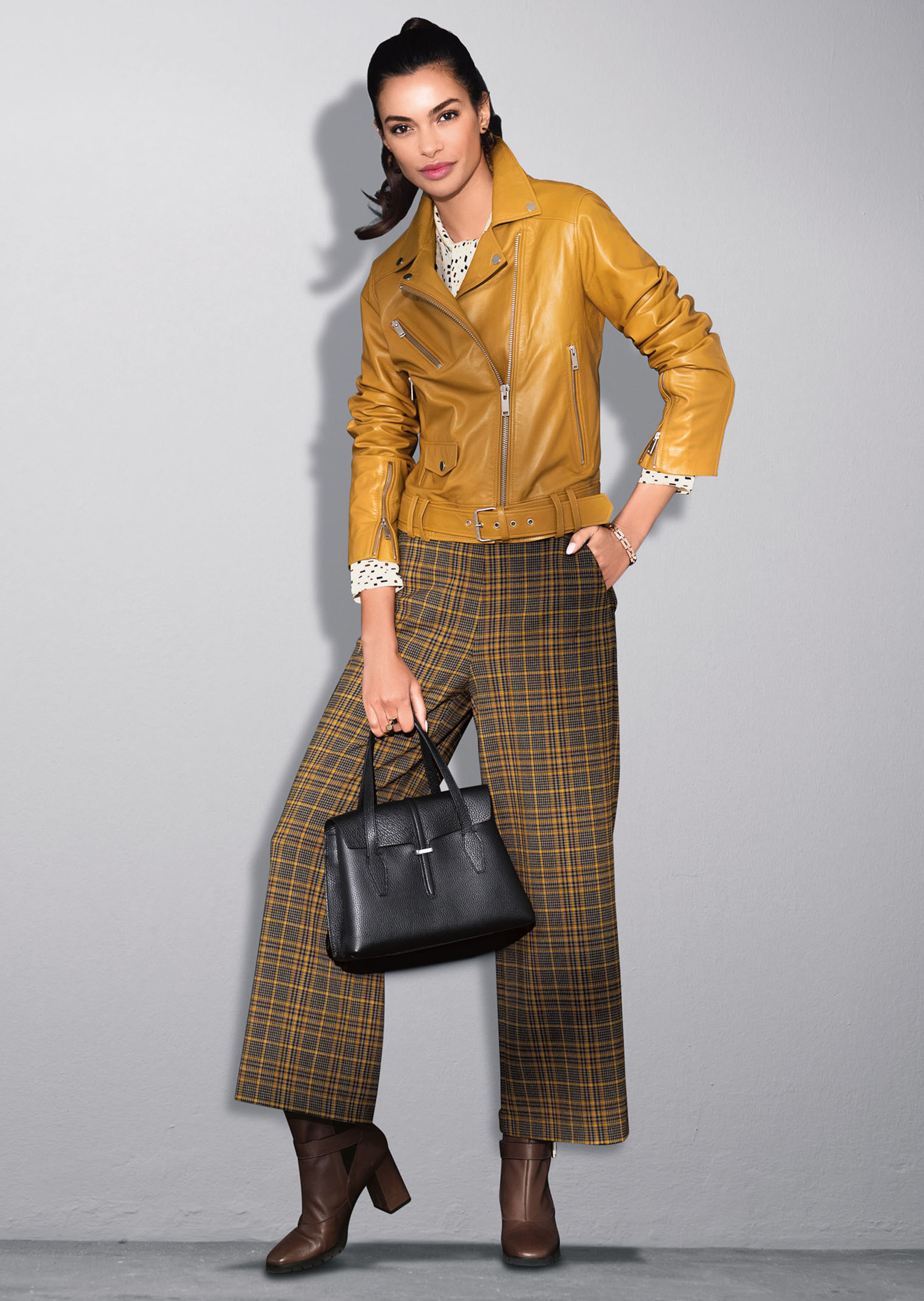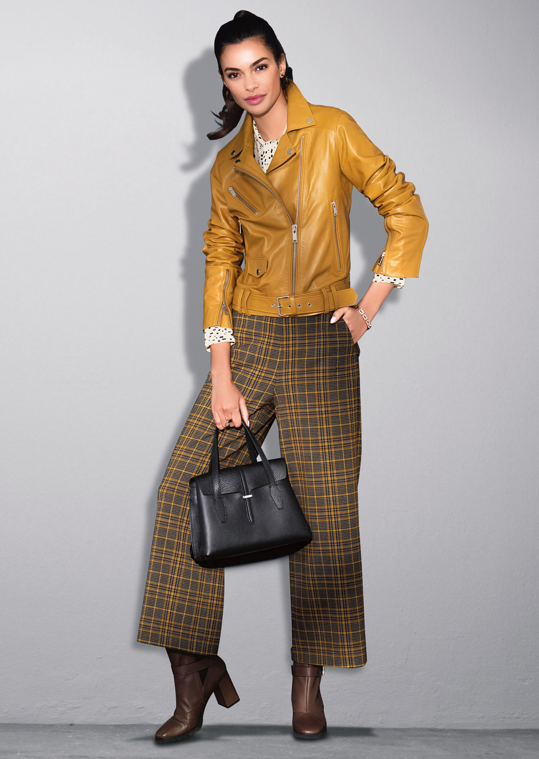 Ihr kesser, kerniger Style und ihre trendige Farbgebung machen sie zum unbedingten It-Piece. Die kurze Biker Lederjacke aus Lammnappa können Sie lässig oder elegant kombinieren. Zu natürlichen Tönen gibt sie einen schönen Farbakzent. Schlank und leicht tailliert setzt sie in angesagter Kurzform den Trend. Ausgestattet ist sie mit Kragen, Revers, asymmetrischem Zipper, Brust-Zierzipper, MADELEINE Kettenaufhänger, Zippertaschen, Ärmelzippern und Zierpatte. Der Gürtel am Saum setzt den zusätzlichen Akzent.
