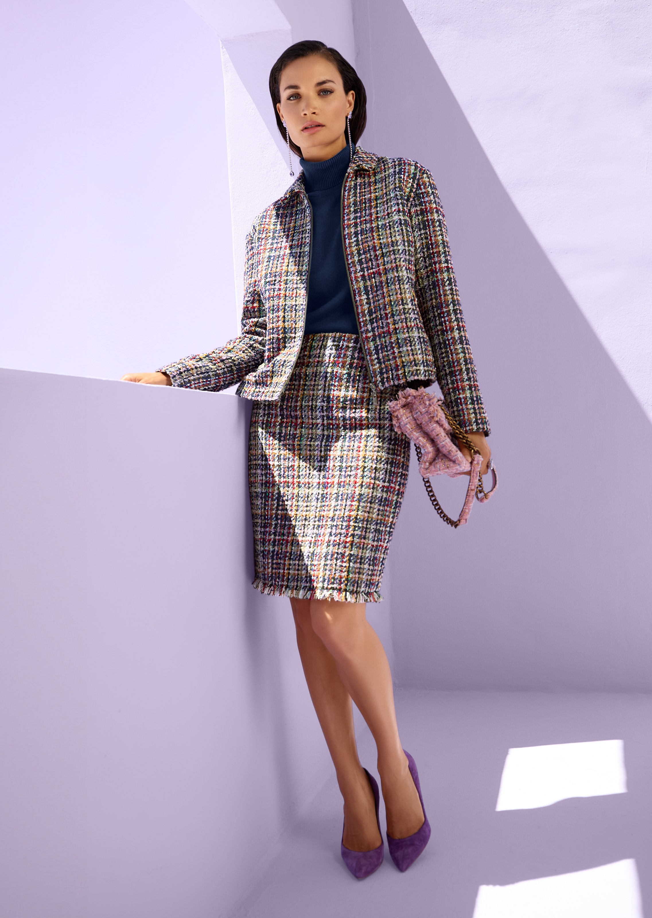 An Tweed kommt in dieser Saison niemand vorbei. Die ausdrucksstarke Qualität setzt markante Akzente und Kombinationen von leger bis gepflegt aufregend in Szene. So wie der Bouclé-Tweed dieses Rocks, der in seiner kurzen, schlanken Bleistiftform den Spagat zwischen sexy und elegant gekonnt meistert. Der bundlose Style schmiegt sich perfekt an die Hüfte und sorgt durch den rückseitig gearbeiteten Reißverschluss für bequemes Ein- und Aussteigen. Modisches Highlight ist die gefranste Saumkante, die ein Plus an Raffinesse und Modernität ins Spiel bringt. Der rückwärtige Gehschlitz schenkt angenehme Bewegungsfreiheit und rundet den Look souverän ab.