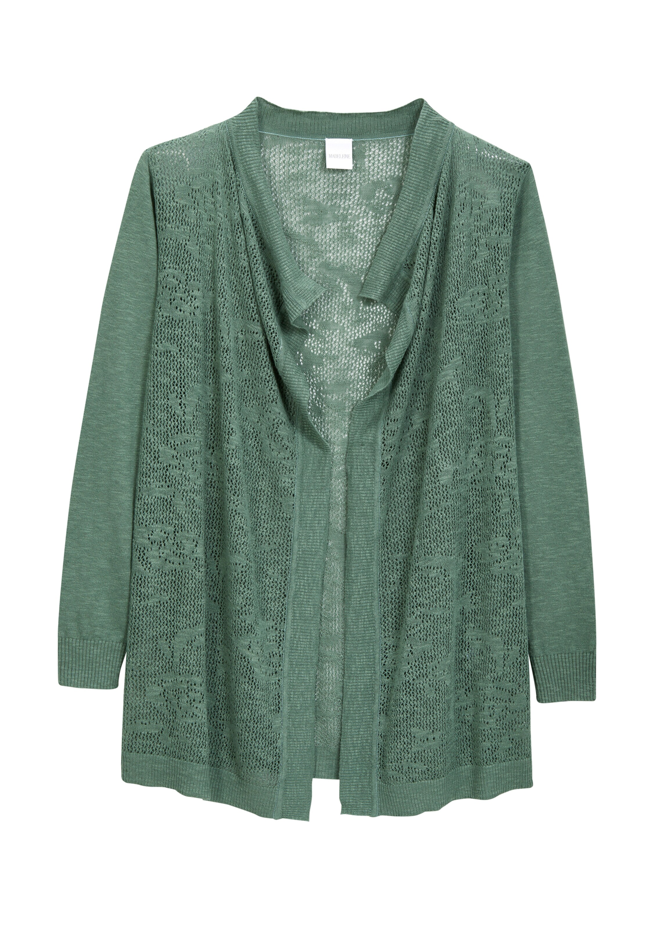 Eine Longstrickjacke, die sich herrlich leicht an warmen Tagen trägt. Die lange Ajourstrickjacke aus luftigem, dezent transparenten Floral-Ajourstrick lässt ganz fein das Darunter hervorblitzen. Der Naturgarnstrick aus Leinen und Baumwolle trägt sich angenehm kühl. Die verschlusslose, legere Form ist mit langen Glattstrickärmeln und Rippstrickkanten gestaltet. Kombinieren Sie sie zu tonigen Partnern oder zu strahlendem Weiß für einen frischen Sommerlook.